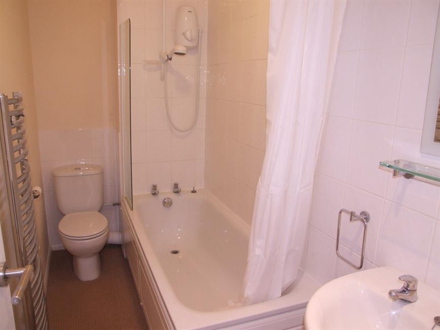 A modern white suite comprising panel enclosed bath with wall mounted Aqualisa power shower, low level wc, pedestal wash hand basin, part tiled walls, heated towel rail, extractor fan.