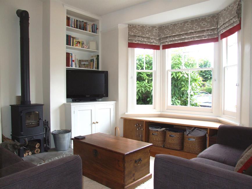 Feature front aspect sash bay window, wood burning stove with stone hearth, fitted display cabinets, radiator, TV point, picture rail, exposed floorboards.