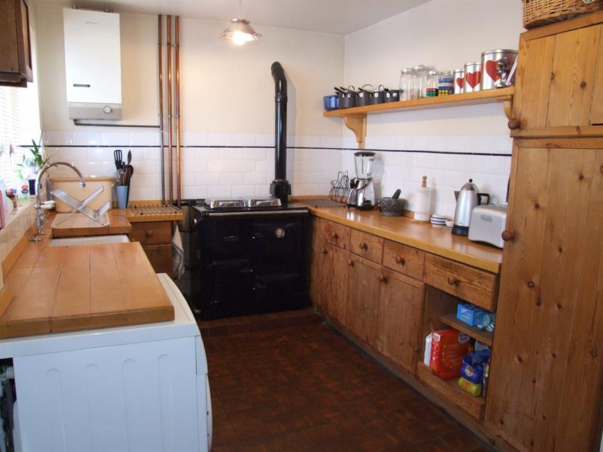 A cottage style kitchen with a range of fitted wooden cabinets with solid wood worktops, inset butler sink with mixer tap, fitted gas fired Rayburn, space and plumbing for washing machine, space for fridge/freezer, access to loft space, part tiled walls, tiled floor, radiator, wall mounted Potterton boiler, side aspect window, stable style side door.