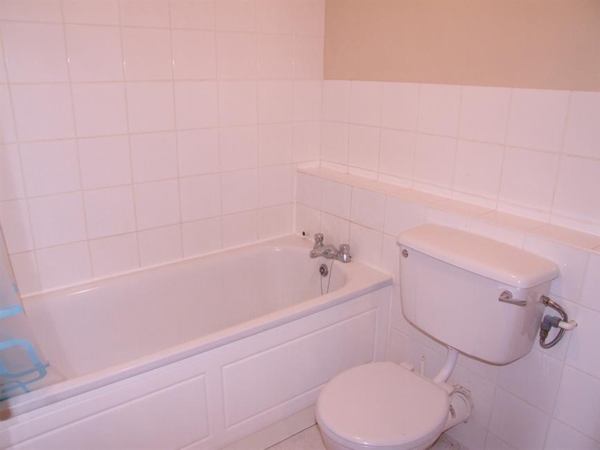 Three piece suite comprising of panel enclosed bath with hot and cold mixer taps, electric shower, low level wc, pedestal wash hand basin with hot and cold taps, part tiled walls, radiator with thermostat control valve, tiled floor, extractor fan, single ceiling light point.