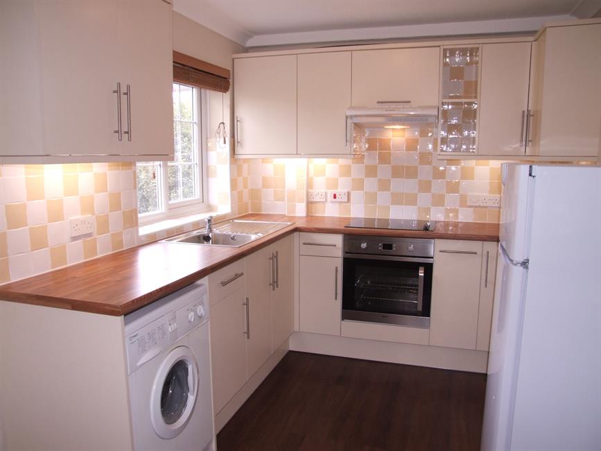 Side aspect UPVC double glazed georgian style window with venetian blinds, full range of eye and base level units with roll top work surface, stainless steel sink unit with hot and cold mixer taps and drainer, unit lighting, washing machine, built-in four ring ceramic hob with built-in electric below and extractor hood above, tall standing fridge/freezer, part tiled walls, laminate wood flooring, coving, single ceiling light point.