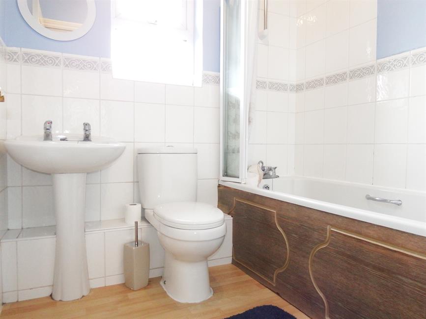 Matching white suite with panel enclosed bath with victorian style mixer taps and shower attachment, low level w.c, pedestal wash hand basin, part tiled walls, laminated wood floor, extractor fan, front aspect double glazed window