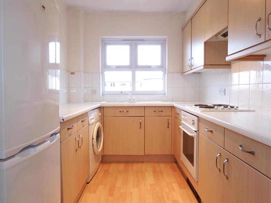 9' (2.74m) x 7'6 (2.28m). Modern and comprising of a matching range of eye level and base level units with roll edged work surfaces, 1 1/2 bowl sink unit with mixer taps, integral electric hob and oven and extractor hood above, tall standing fridge/freezer, washing machine, part tiled walls, front aspect window with attractive views.