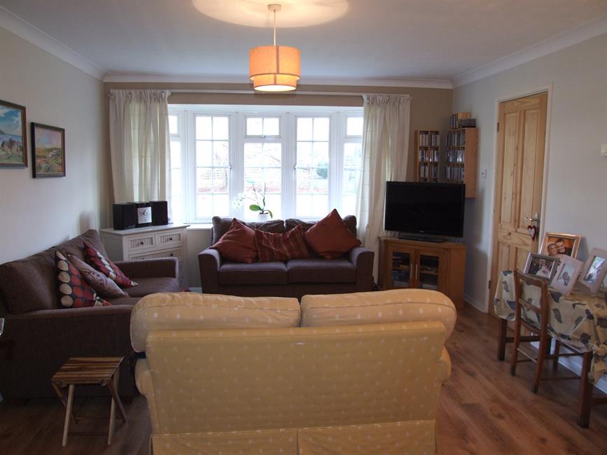 The property is extremely well presented throughout comprising entrance hall, cloakroom, living room, modern fitted kitchen, breakfast room with sliding doors opening onto a patio area, family room/bedroom 3, two further double bedrooms, separate WC and three piece bathroom suite. Outside, front and rear gardens with access to a garage in a nearby block.