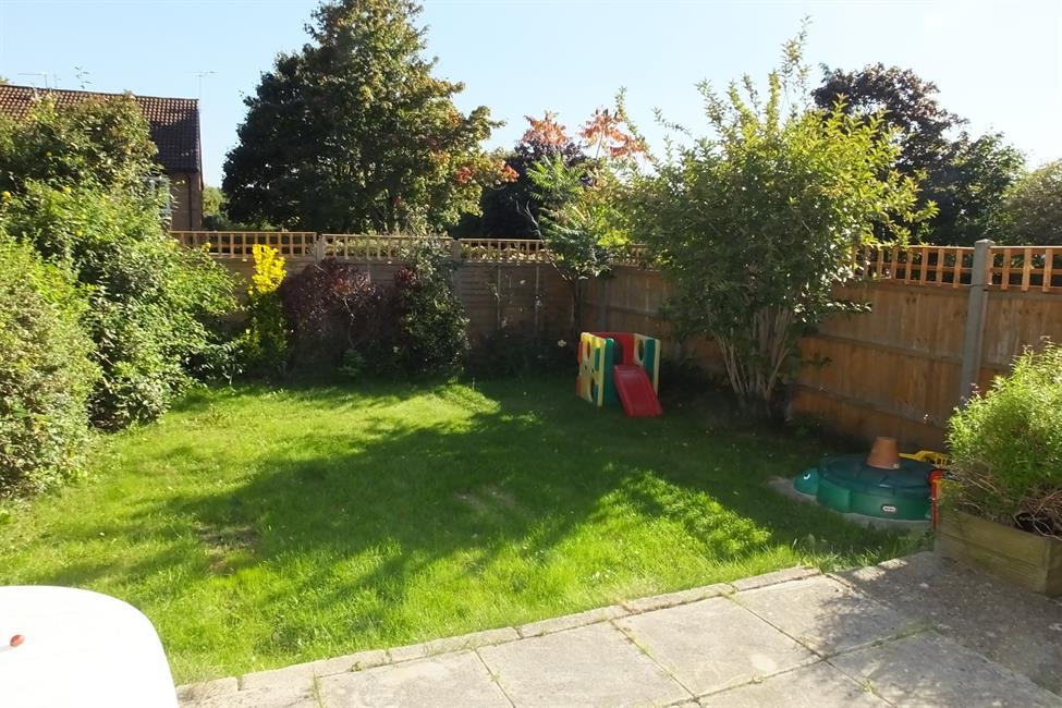 The accommodation comprises entrance hall, living room with sliding door opening onto a particularly large rear garden, modern fitted kitchen, three bedrooms two with built-in wardrobes and a modern fitted bathroom. Other benefits include double glazing and a garage. Unfurnished.