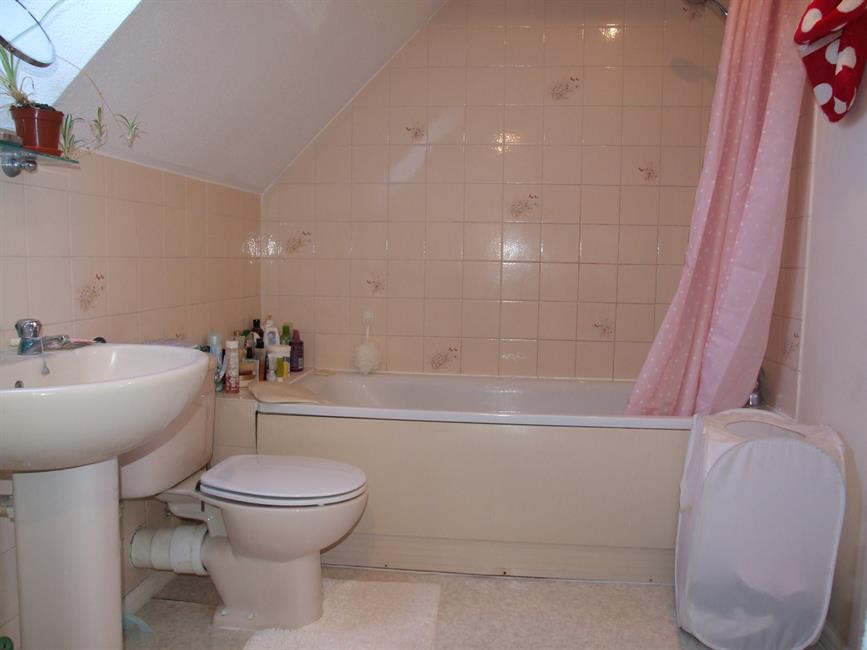 Large bathroom with bath, wash hand basin and WC. Mixer tap shower with wall attachment. Washing machine and dryer. Deep eaves cupboard.