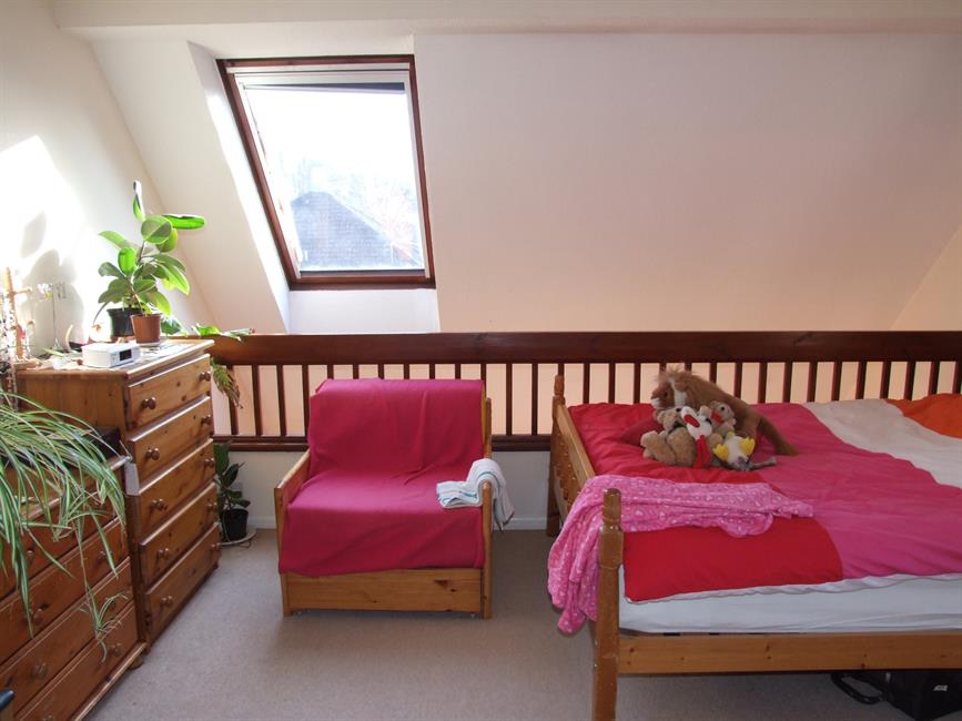 Double aspect overlooking the communal gardens and further lit by a high Velux window above a galleried wall. Double built in wardrobe.