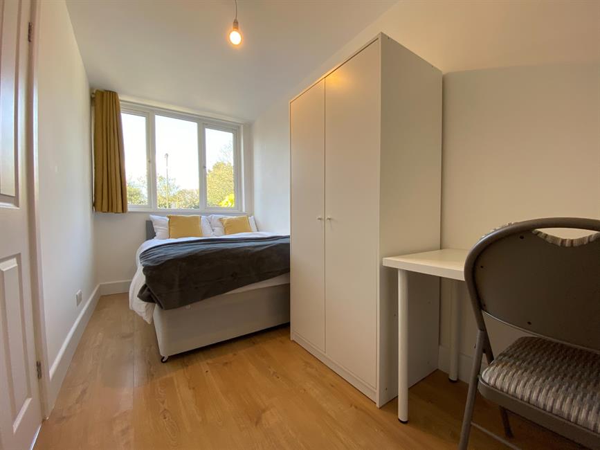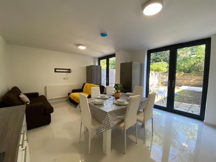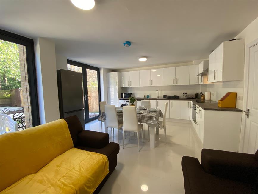 Ground floor room to rent with en-suite shower rooms ideally situated in a quiet cul de sac and ideally located just 0.2 miles from Woking's main line rail station and town centre, all the occupants benefit and have access to a communal luxury fitted open plan kitchen diner including 2 large tall standing fridge freezers, ceramic induction hob, electric oven, dishwasher, dryer & washing machine, a communal living room with 2 sofas and a wall mounted flat screen TV connected to Virgin TV. All the rooms are equipped with cabled CAT V high speed Virgin Broadband. The property has been installed with a brand new Gas Central Heating system with all of the rooms benefiting from a thermostatically controlled radiator. The communal garden (which also has rear access) is astro turfed with a large patio area and communal bike storage shed (3mx3m). A weekly cleaner is included (communal hall, stairs, landing, kitchen & living room).