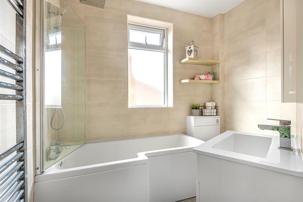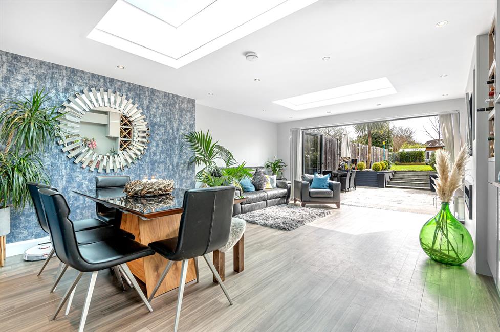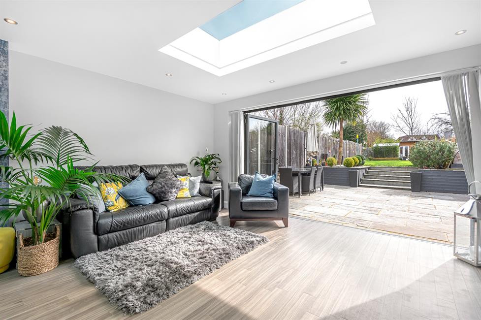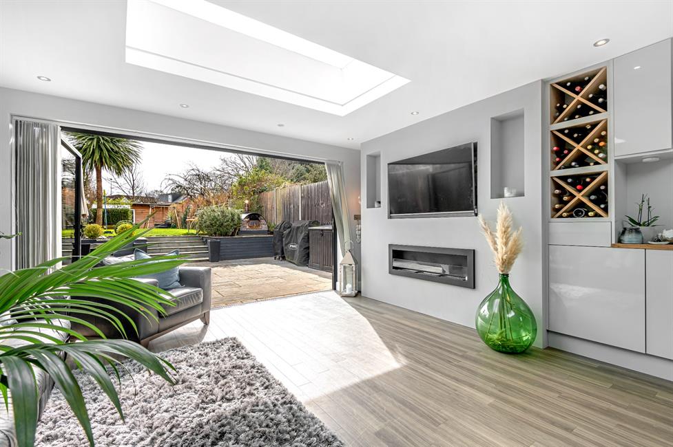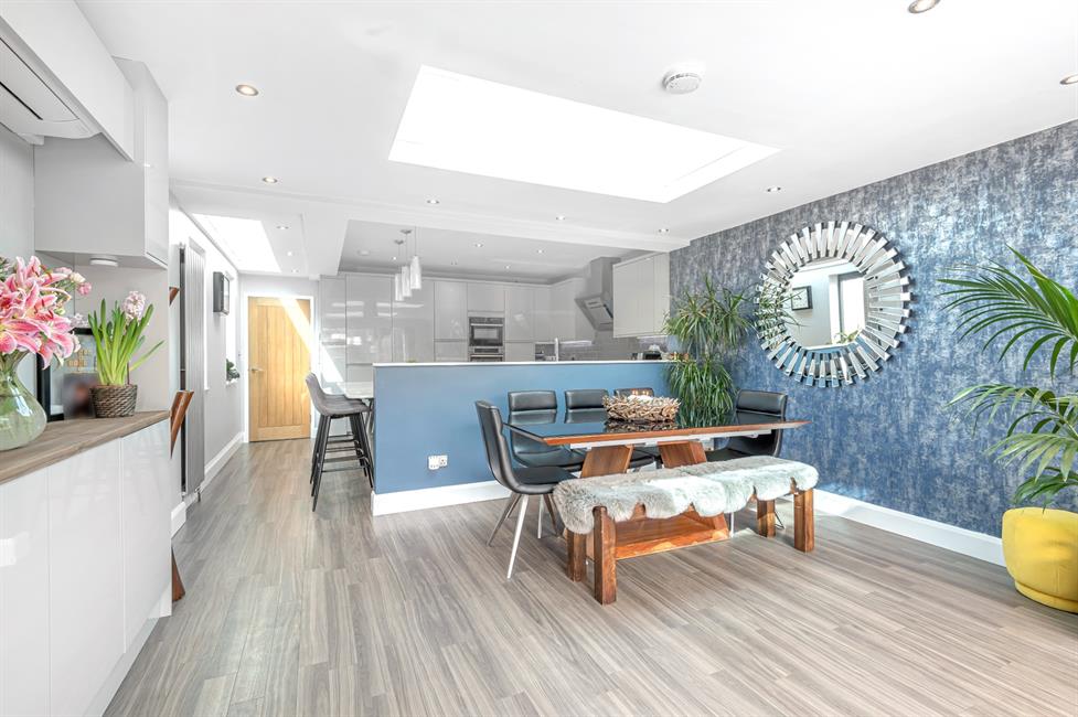 The property has been skillfully extended to create a fabulous 32ft open plan kitchen/dining/living room with sky lantern and bi-folding doors to the southerly facing rear garden. The kitchen is luxuriously appointed and incorporates a granite breakfast bar. The living area benefits from a bespoke fitted media unit, further storage cabinets and a contemporary style fireplace. There is also a separate sitting room (currently used as a bedroom), shower room and utility room on the ground floor. Upstairs there are three large double bedrooms and a well appointed family bathroom.