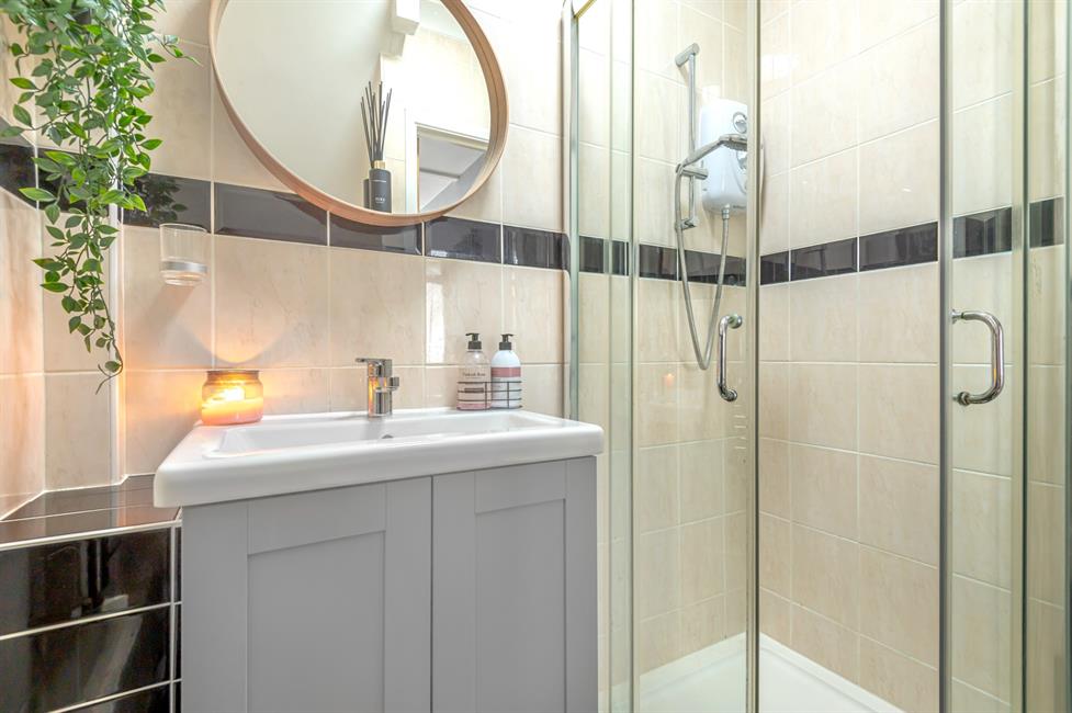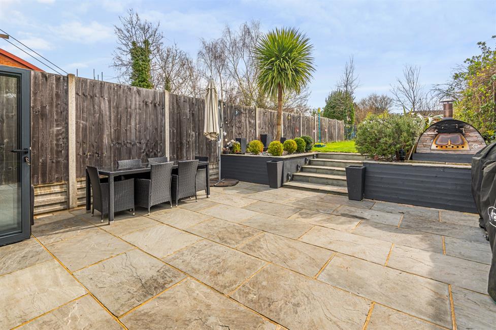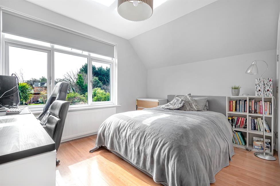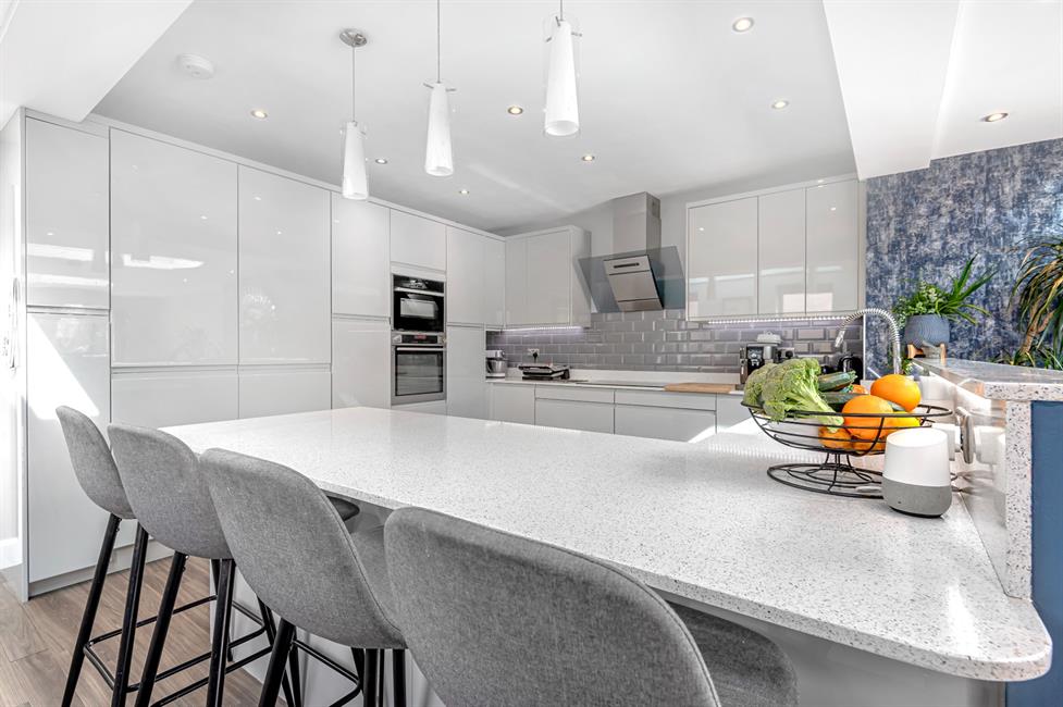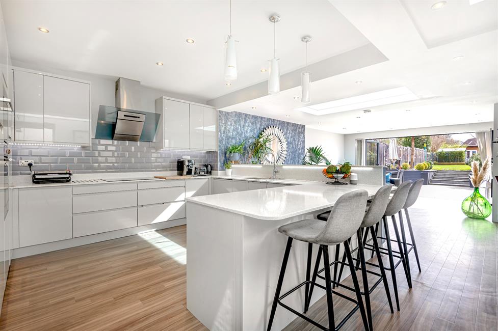 The property has been skillfully extended to create a fabulous 32ft open plan kitchen/dining/living room with sky lantern and bi-folding doors to the southerly facing rear garden. The kitchen is luxuriously appointed and incorporates a granite breakfast bar. The living area benefits from a bespoke fitted media unit, further storage cabinets and a contemporary style fireplace. There is also a separate sitting room (currently used as a bedroom), shower room and utility room on the ground floor. Upstairs there are three large double bedrooms and a well appointed family bathroom.