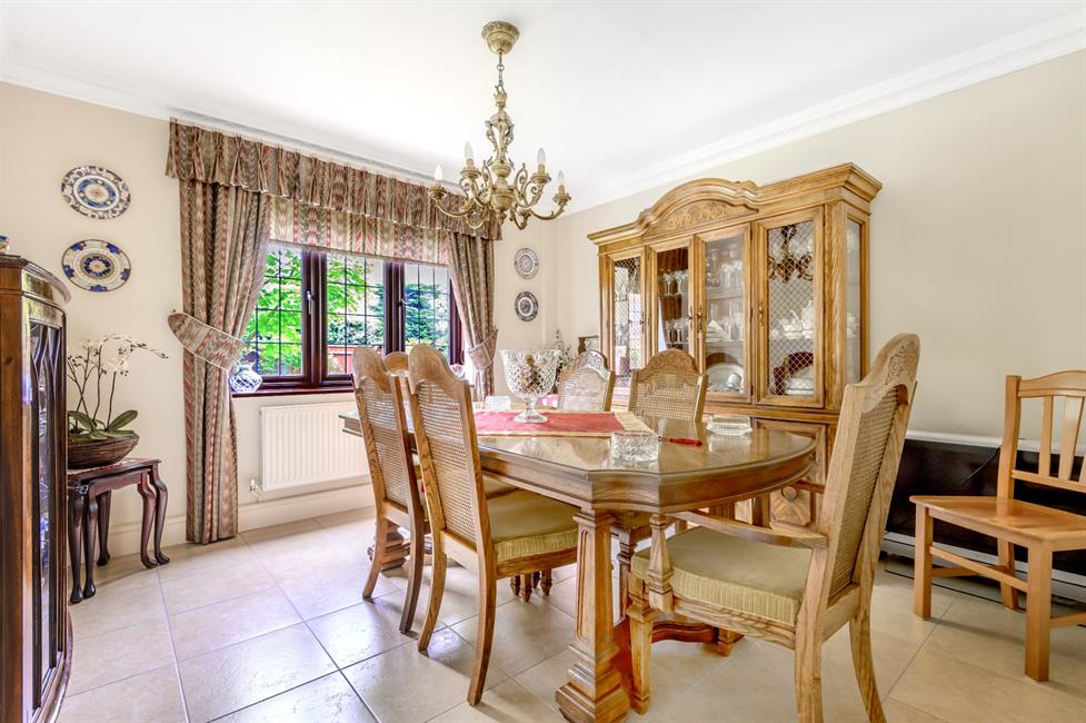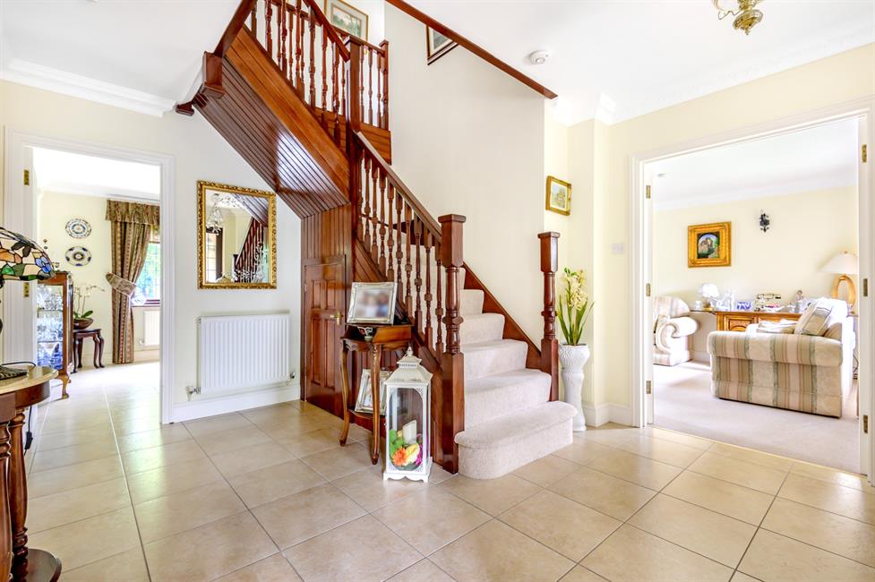 There are five good size bedrooms, four of which are doubles. All bedrooms have built in wardrobes and the principal bedroom benefits from a large and well appointed en-suite. On the ground floor, a welcoming reception hall with central turning staircase and cloakroom, double aspect living room, separate dining room, study, a modern kitchen leading to a breakfast/family room, and a utility room.