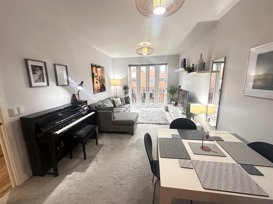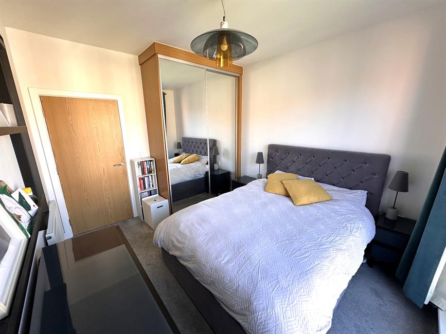 The welcoming entrance hall, enhanced by an impressive 8’10” ceiling height, features a security entry system and two generous walk-in storage cupboards fitted with floor-to-ceiling shelving. The bright and spacious living area opens through double doors to a large private balcony, while the luxury open-plan kitchen is elegantly appointed with granite worktops, upstands, and splashbacks, an integrated dishwasher and washer/dryer, space for a fridge freezer, under-unit lighting, and premium laminate flooring. The master bedroom enjoys double doors leading to a Juliet balcony, enhancing the apartment’s light and sense of space. A stylish and contemporary family bathroom completes the accommodation.