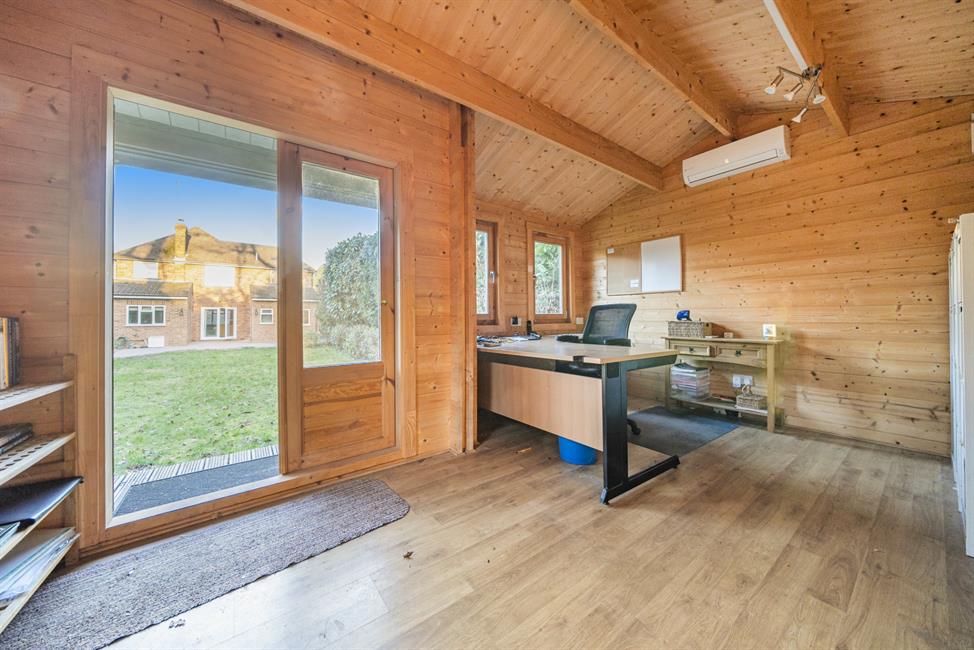 Nestled within a highly sought-after cul-de-sac, this rarely available four-bedroom detached family home offers spacious and well-balanced accommodation, ideally positioned for both Woking and West Byfleet mainline stations. The ground floor provides versatile living with three reception rooms, including a generous living room, dining room and study, alongside a well-appointed kitchen. Upstairs, four well-proportioned bedrooms are arranged off the landing, including a principal bedroom with en-suite, complemented by a family bathroom. Externally, the property enjoys a mature rear garden of good size, featuring an insulated log cabin with heating and air conditioning, ideal as a home office or leisure space. To the front, a block-paved driveway leads to an integral garage, offering ample off-street parking.