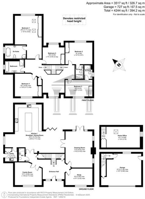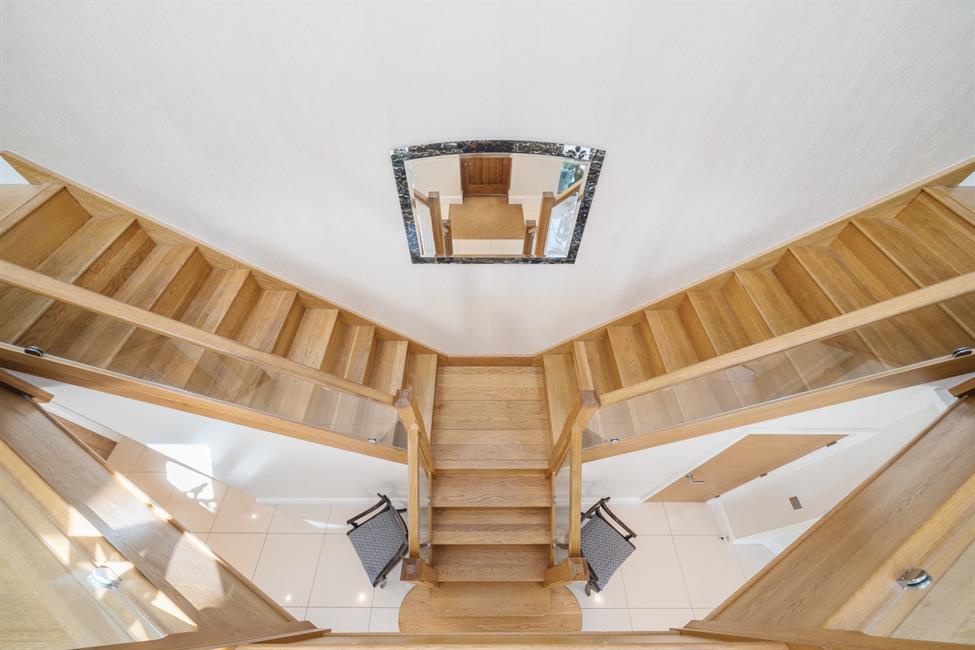 Upstairs, a striking galleried landing provides access to five generously sized double bedrooms, each designed with comfort and elegance in mind. The primary suite offers a true retreat, featuring a striking vaulted ceiling and a spacious, luxurious en-suite bathroom. In addition, there are four well-appointed bedrooms, two of which include their own private en-suites, providing both privacy and convenience for family members and guests. A central family bathroom is available for the remaining bedrooms. Throughout, the home, underfloor heating and concrete floors ensure comfort and durability, enhancing the sense of quality craftsmanship.