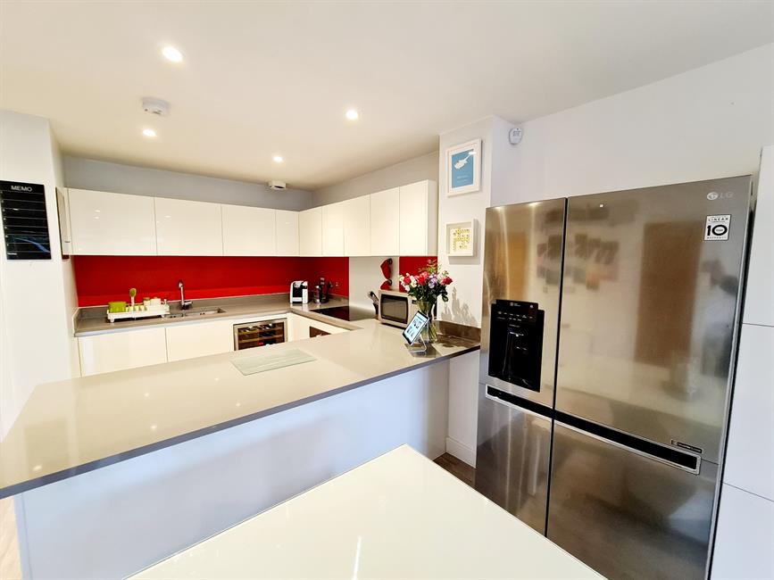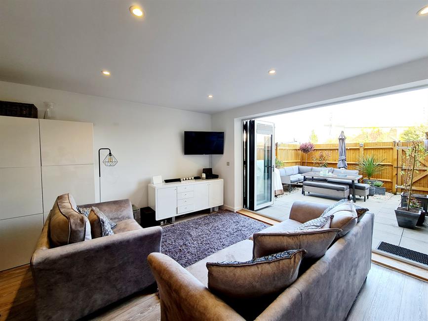 The spacious accommodation is arranged over three floors and comprises a spacious open plan living/kitchen/dining room with bi-fold doors leading to the garden terrace. The kitchen is beautifully presented with a range of integrated appliances. On the first floor there are three bedrooms and a family bathroom. To the top floor is a simply stunning principal suite with vaulted ceiling and large doors leading to a roof terrace. The principal suite also boasts a dressing room and beautifully presented en-suite shower room. The property also has a driveway to the front for two cars.
