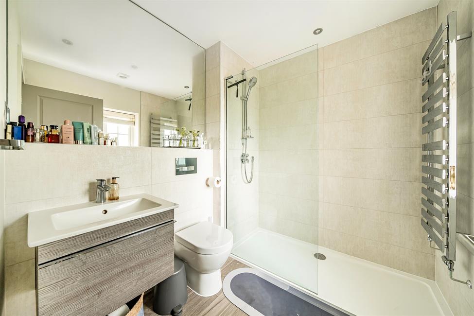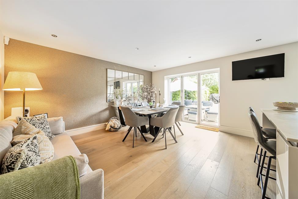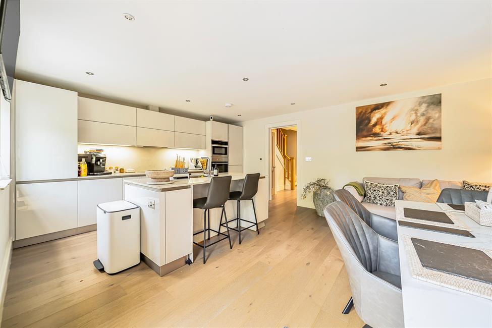 The ground floor welcomes you with a beautifully designed open-plan kitchen/dining/family room — the true heart of the home. Ideal for both everyday living and entertaining, this expansive space combines style with practicality. The sleek kitchen is thoughtfully appointed, while full-height glazing draws in natural light and creates a seamless connection to the private, low-maintenance rear garden, complete with a paved terrace for al fresco dining and relaxation.