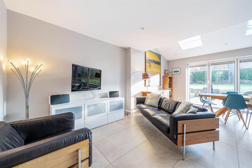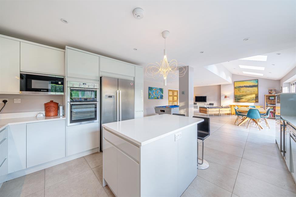 Upstairs, discover five impressive double bedrooms, including the principal bedroom complete with a separate dressing room and an en-suite wet room. A further guest bedroom with an en-suite shower room. Outside, a south-facing garden awaits, complemented by a large paved terrace, perfect for entertaining or enjoying moments of serenity. The property is completed by an integral garage with an automated door, providing both security and ease of access. This residence epitomises modern family living in a prime location, offering a perfect blend of style, comfort, and convenience.