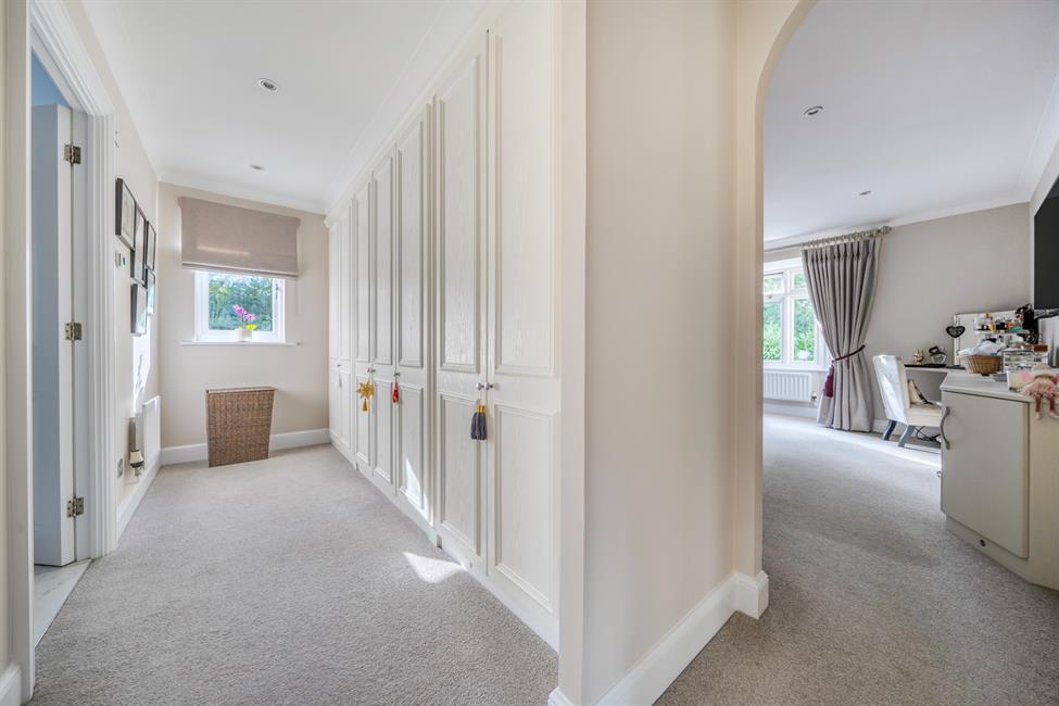 Upstairs, a galleried landing with balcony leads to five generously proportioned double bedrooms. The principal suite enjoys a bay window overlooking the gardens, a dressing room with fitted wardrobes, and a luxurious en-suite bathroom. Two further bedrooms benefit from en-suite facilities, while the remaining bedrooms are served by a spacious family bathroom. The guest suite also offers fitted wardrobes and a beautifully appointed en-suite shower room, ideal for visitors.