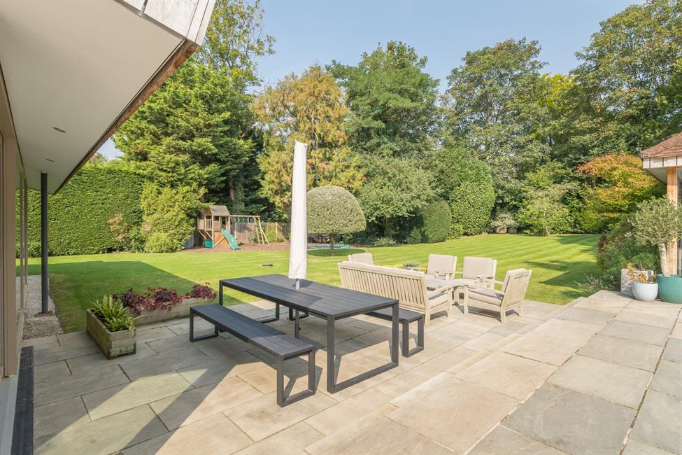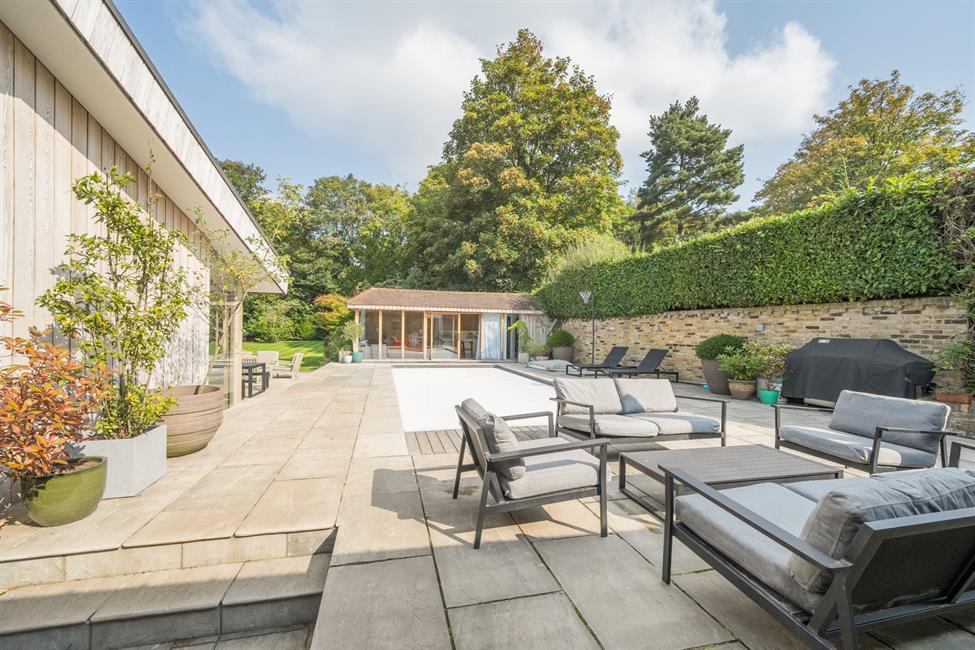 Outside, the property continues to impress with a private garden, perfect for relaxation or outdoor dining on the garden terrace. The swimming pool and adjoining pool house further elevate the sense of luxury, offering a tranquil setting for recreation. To the front, a generous driveway provides ample off-road parking for five cars, ensuring convenience and ease for family and guests alike.
