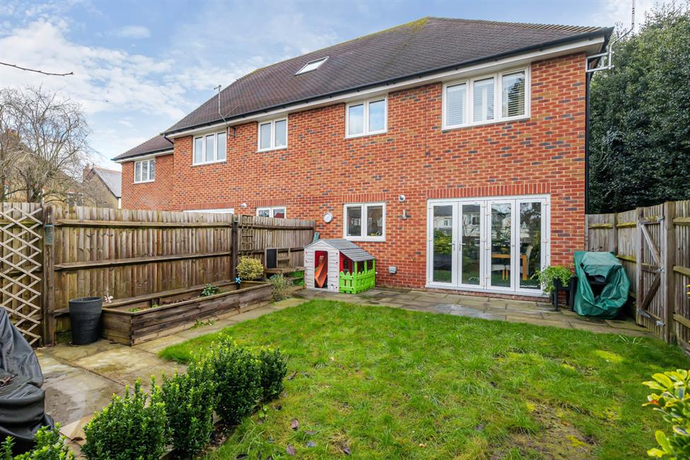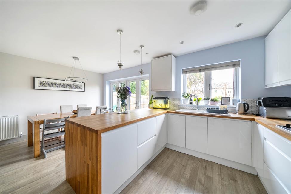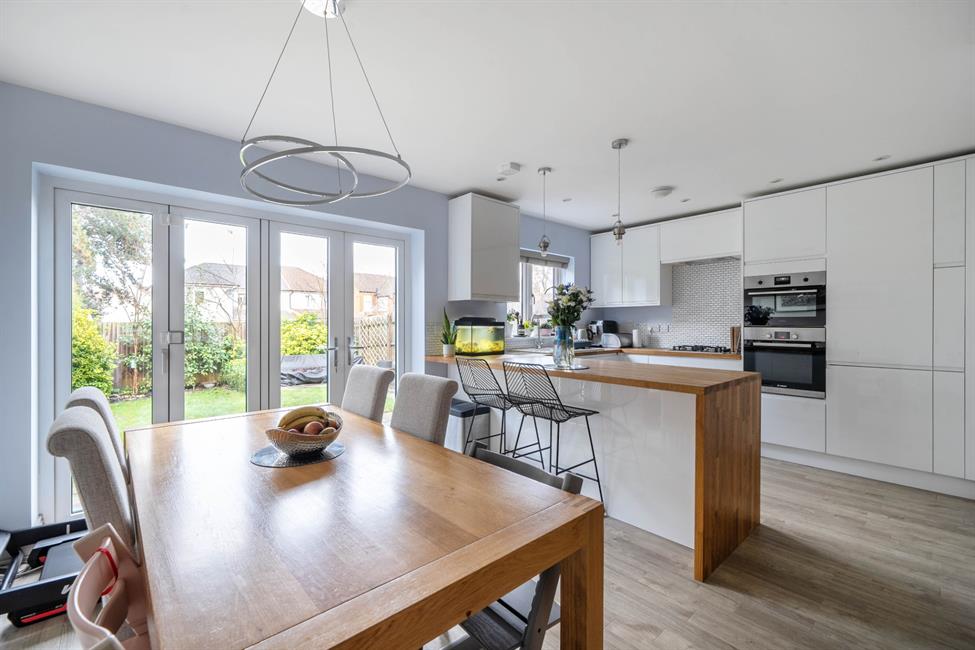 Offering modern elegance and spacious living, the property features an open-plan kitchen and dining area, a convenient downstairs cloakroom, and a generously sized living room. The living space is enhanced by bi-fold doors that open onto a private rear garden, seamlessly blending indoor and outdoor living. Upstairs, the property offers four well-proportioned bedrooms, including a luxurious principal suite complete with an en-suite shower room. The remaining bedrooms are served by a family bathroom.