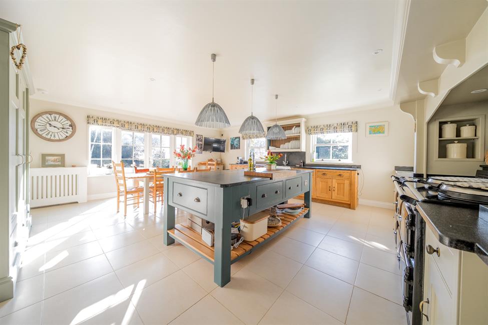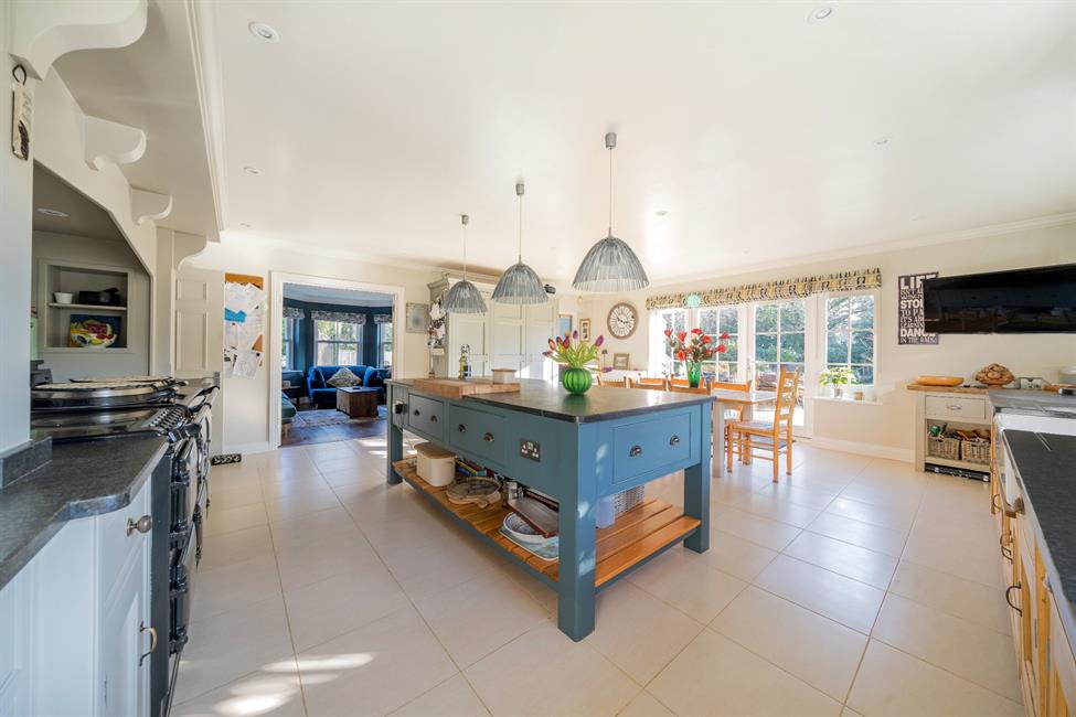 Step inside to discover an interior that radiates sophistication and warmth. A grand central entrance hall sets the tone, leading to a series of refined reception spaces perfect for both entertaining and everyday living. The triple-aspect drawing room is a standout feature, adorned with rich oak flooring, an elegant accent wall, and a working stone fireplace, all complemented by French doors that open onto the serene gardens. Adjacent, the formal dining room captures the home's heritage with bay windows and tasteful décor, while the private study offers a quiet retreat. The heart of the home lies in the expansive Thomas Ford & Sons kitchen/breakfast room, where solid wood cabinetry, sleek black granite countertops, and a classic Aga create a welcoming space, seamlessly connected to a cosy family room and a sun-drenched south-facing patio.