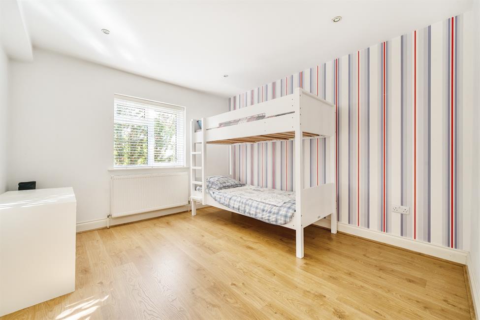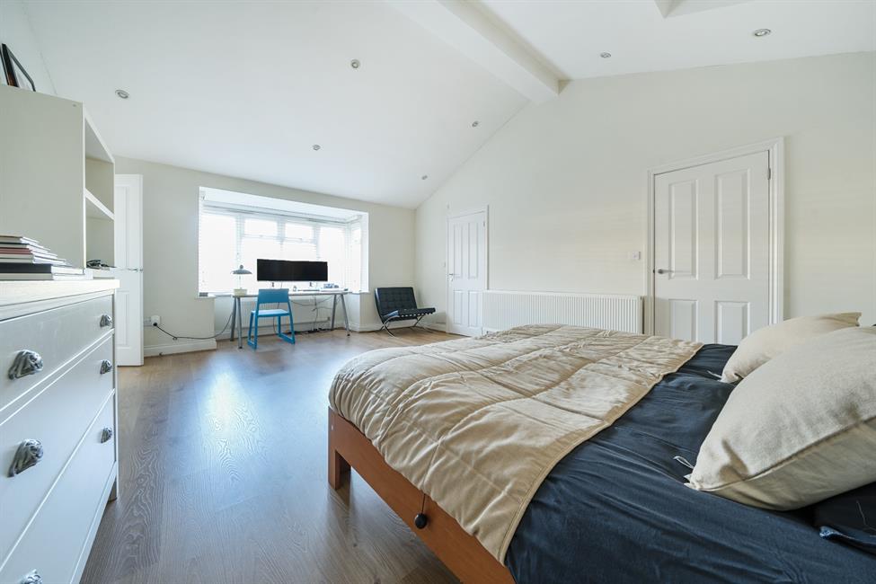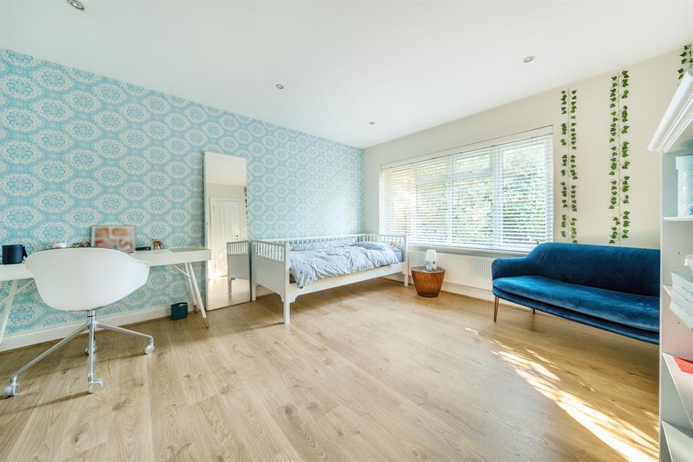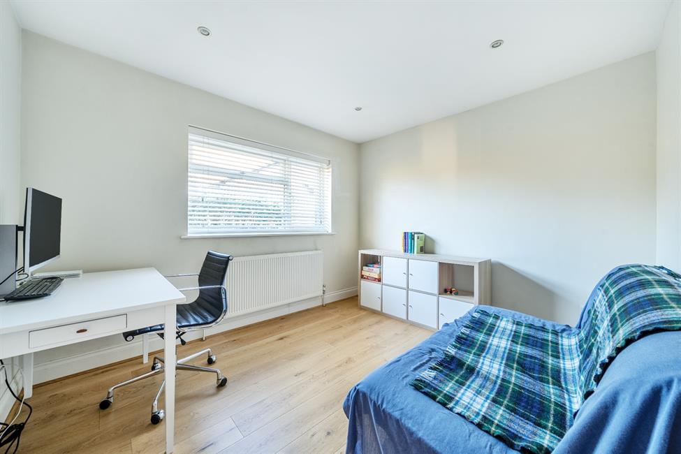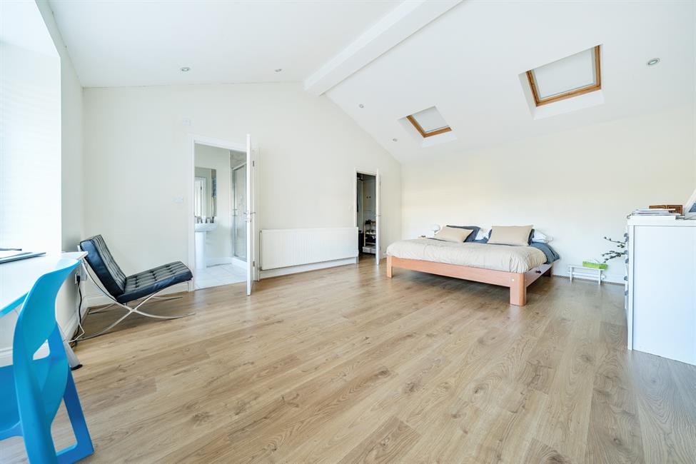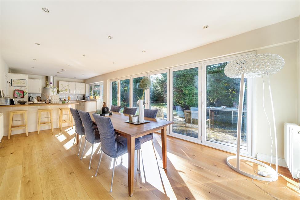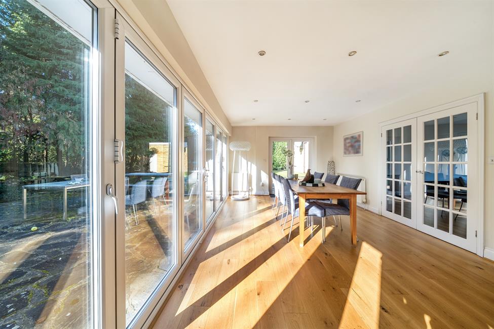 At the heart of the home is a stunning open-plan kitchen and dining area, featuring bi-folding double-glazed doors that seamlessly connect the indoors to the garden, creating a bright and inviting space for entertaining. A spacious reception room, complete with a central fireplace, adds warmth and charm. Additionally, a second reception room offers flexibility, serving as either a home office or a fifth bedroom.