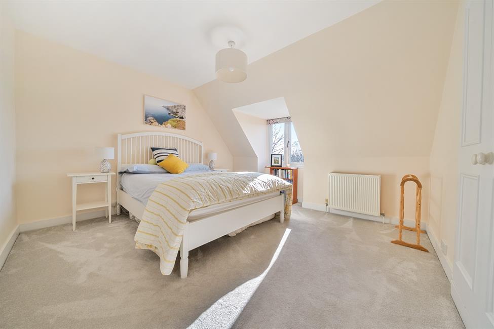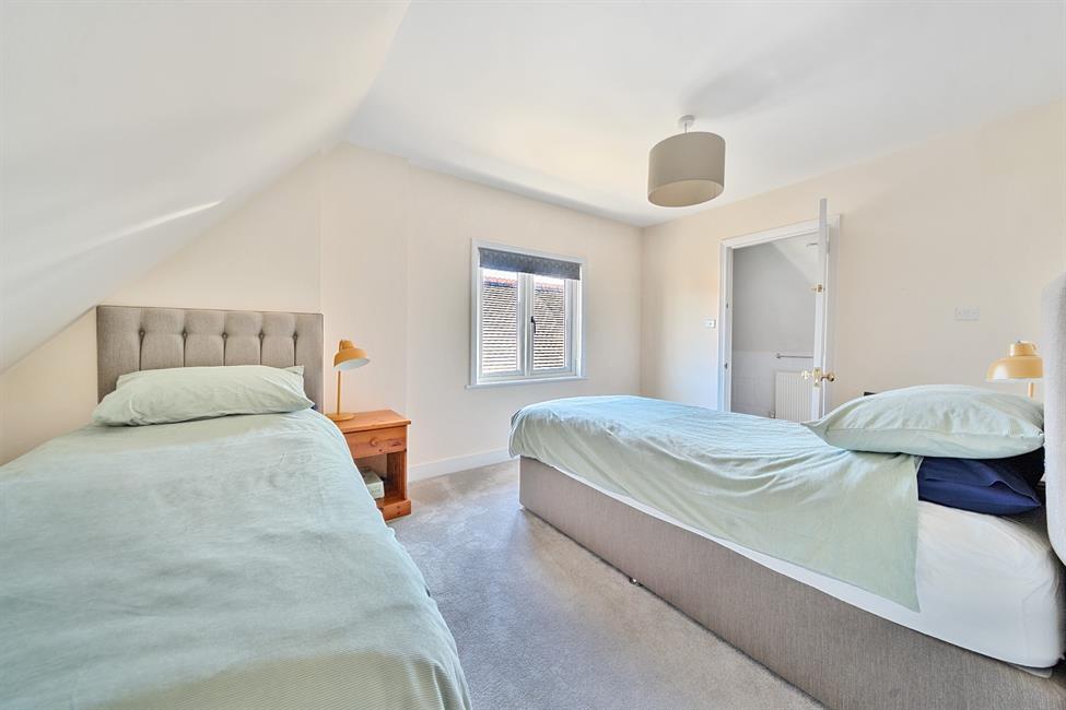 Ascending the beautifully crafted staircase, the upper floors reveal six well-appointed bedrooms, including a sumptuous principal suite with garden views, custom blinds, and Cole & Sons woodland patterned accents. This serene retreat features a spacious en-suite with Perrin & Rowe fixtures, a waterfall marble-tiled shower, and an inset heritage bathtub. Adjacent, is bedroom two with bespoke Shaker wardrobes, while two further top-floor bedrooms offer excellent privacy—one with an en-suite shower room and the other with a substantial walk-in loft/storage area. An exquisite family bathroom, finished in sage green wall panels, completes the accommodation.