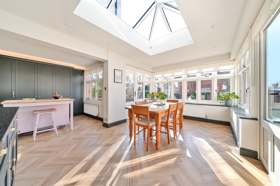 - Stunning Orangery bathed in natural light from a striking roof lantern, seamlessly connecting indoor and outdoor spaces