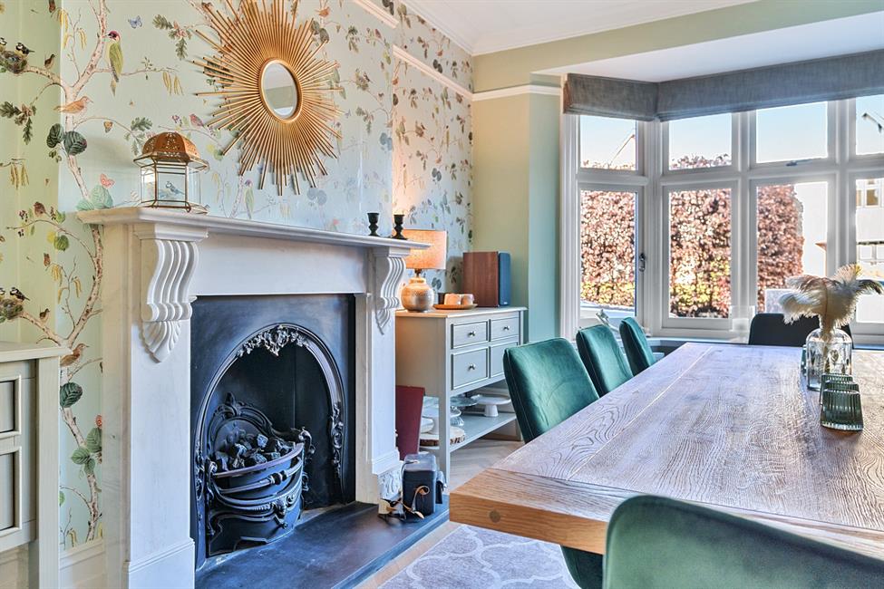 A grand double-fronted facade opens to a central entrance hall, where an impressive turning staircase and original windows flood the space with natural light. The home’s generous proportions are immediately evident, with two exceptional reception rooms and a dedicated study providing versatile living areas. Graceful bay windows, intricate picture rails, and a curated palette of heritage hues enhance the character of each room. The living room, adorned in delicate rose blush tones, features a bespoke integrated home cinema media unit and offers direct access to the sun-drenched patio, through an elegant glazed door.