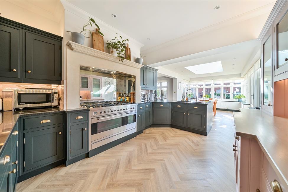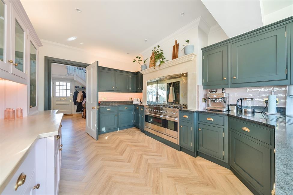 At the heart of the home, an expertly designed extended kitchen/breakfast room serves as a focal point for both family gatherings and entertaining. The spacious orangery, bathed in natural light from a striking roof lantern, opens onto the patio, seamlessly connecting indoor and outdoor spaces. Handcrafted Shaker style cabinetry, finished in a sophisticated combination of dark green and subtle pink, with brass handle accents, provides ample storage, while premium granite countertops, an antique mirror splashback, and a high-end double-width range cooker add a touch of refined luxury. A matching utility room with discreet cloakroom access further enhances practicality.