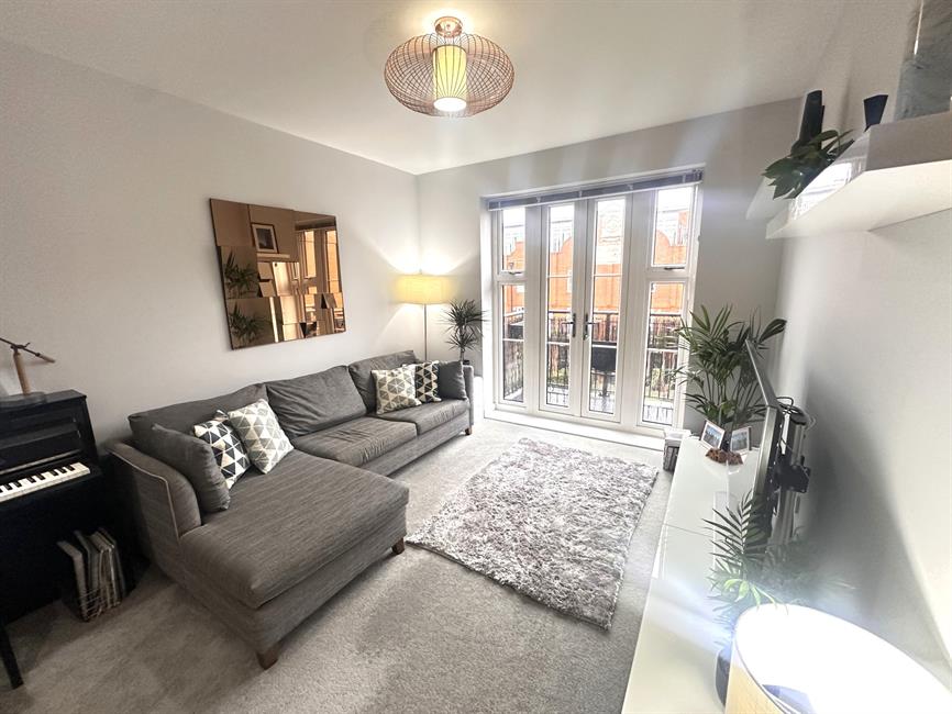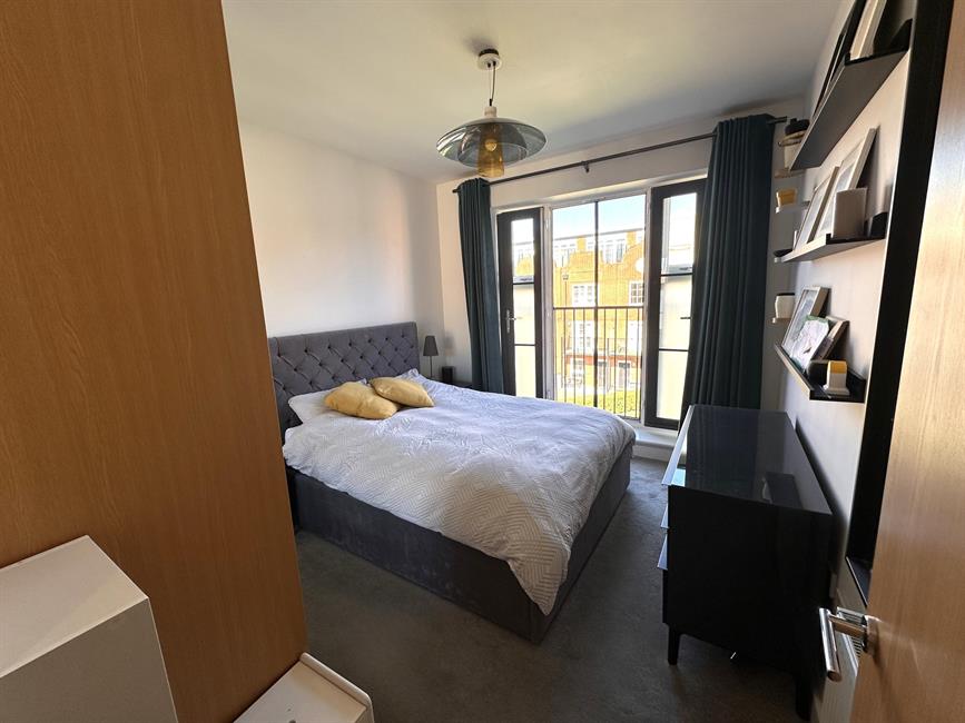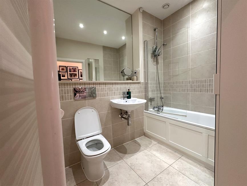 The welcoming entrance hall, enhanced by the impressive 8’10” ceiling height, includes a security entrance phone and two large walk-in storage cupboards, both fitted with floor-to-ceiling shelving. The spacious and light-filled living area benefits from double doors leading to a generously sized balcony, while the luxury open-plan kitchen is elegantly designed with high-quality granite worktops, upstands, and splashbacks. It also features an integrated dishwasher and washer/dryer, space for fridge freezer, under-unit lighting, and premium laminate flooring. The spacious master bedroom enjoys double doors opening to a Juliet balcony, adding to the apartment’s sense of space and elegance. A stylish and contemporary family bathroom completes the accommodation.