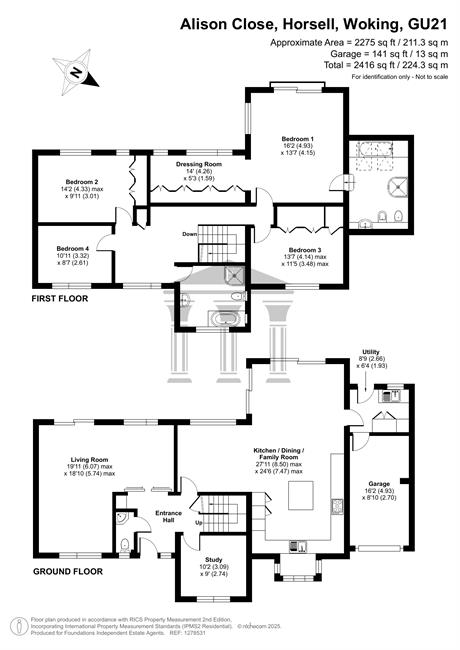 The property has been thoughtfully and substantially extended to create a spacious and versatile living environment. At the heart of the home is a stunning open-plan kitchen/dining/family room, designed for both everyday living and entertaining. This impressive space forms the true hub of the property, offering an inviting and functional layout. In addition, the ground floor features an elegant L-shaped living room, a dedicated study, a utility room, and a downstairs cloakroom. Upstairs, the first-floor landing leads to four generously sized double bedrooms, each offering comfort and style. The principal suite is a particular highlight, featuring a Juliet balcony, an expansive dressing room, and a luxuriously appointed en-suite bathroom. A well-equipped family bathroom serves the remaining bedrooms, all of which are designed with space and natural light in mind.