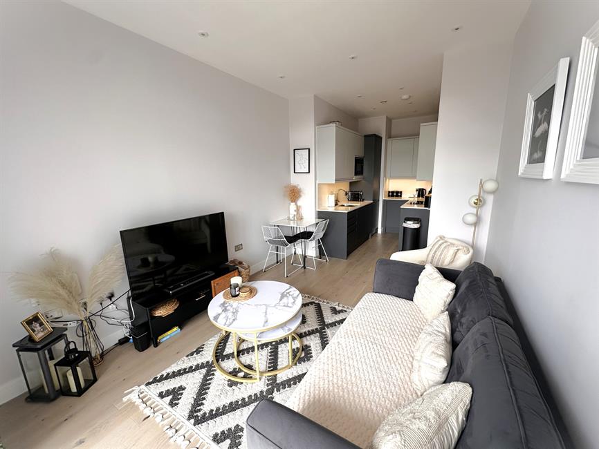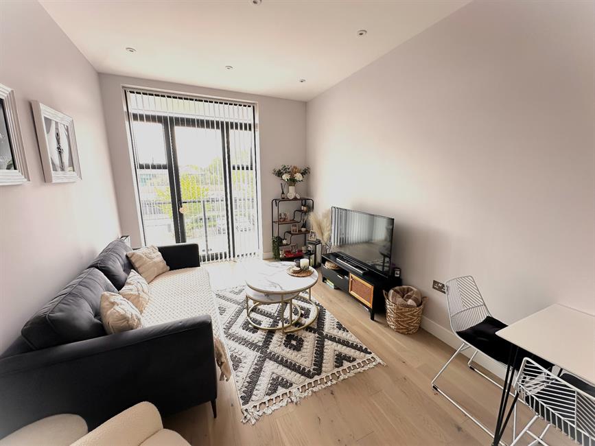 Finished to an immaculate standard and featuring electric heating throughout, this apartment offers a spacious open-plan design that seamlessly integrates the kitchen, dining, and living areas. The modern kitchen is well-appointed, and the living space benefits from a Juliet balcony that enhances the room with natural light and an open-air feel. The thoughtfully designed interior continues with a spacious double bedroom and a luxurious and stylish bathroom.