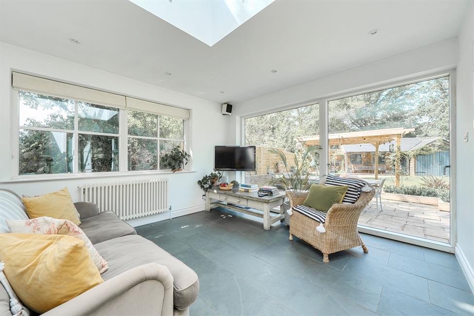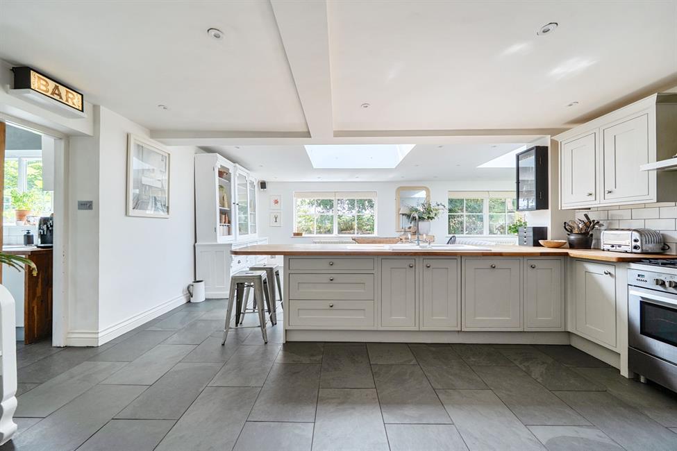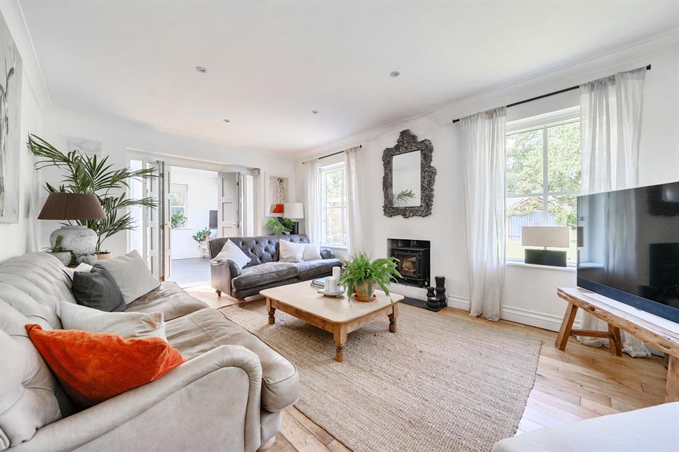 A spacious and welcoming reception hall sets the tone for the rest of the home, leading to a beautifully designed kitchen that seamlessly opens into a bright and airy dining/family room, enhanced by striking roof lanterns that flood the space with natural light. The double aspect living room enjoys picturesque views over the gardens and is centred around a charming wood-burning stove—perfect for cosy evenings.