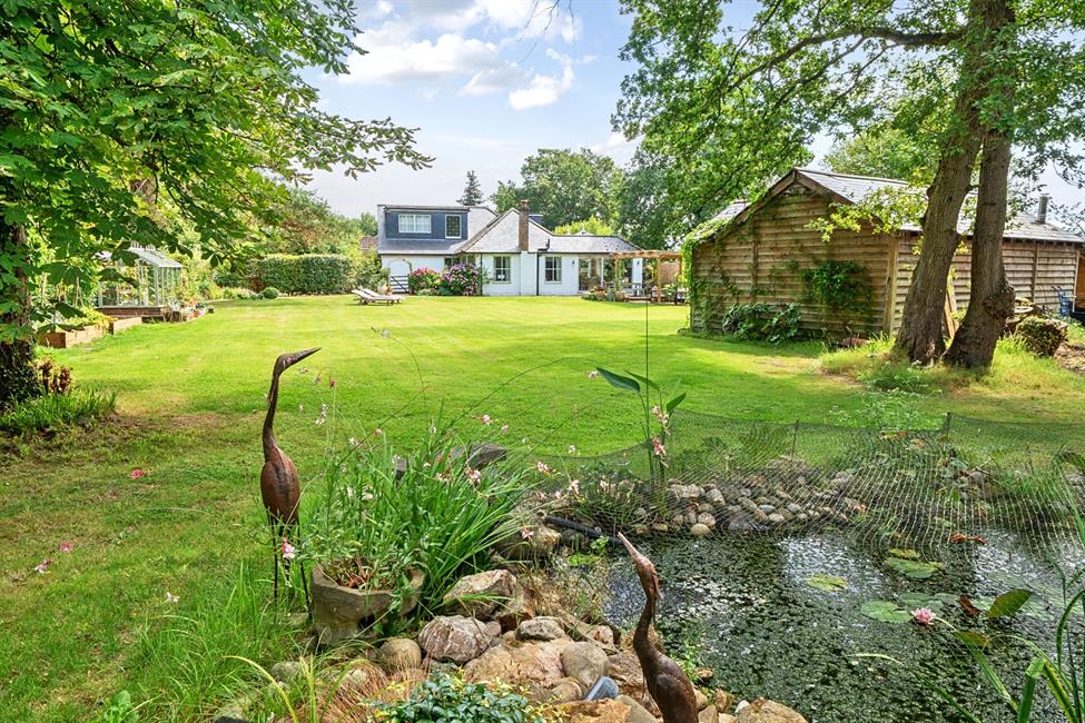 Positioned within this unique setting, nestled between open fields and serene woodland, this distinctive residence combines the peace of the countryside with elegant, versatile living, offering a perfect retreat just a short distance from both Woking and Guildford.