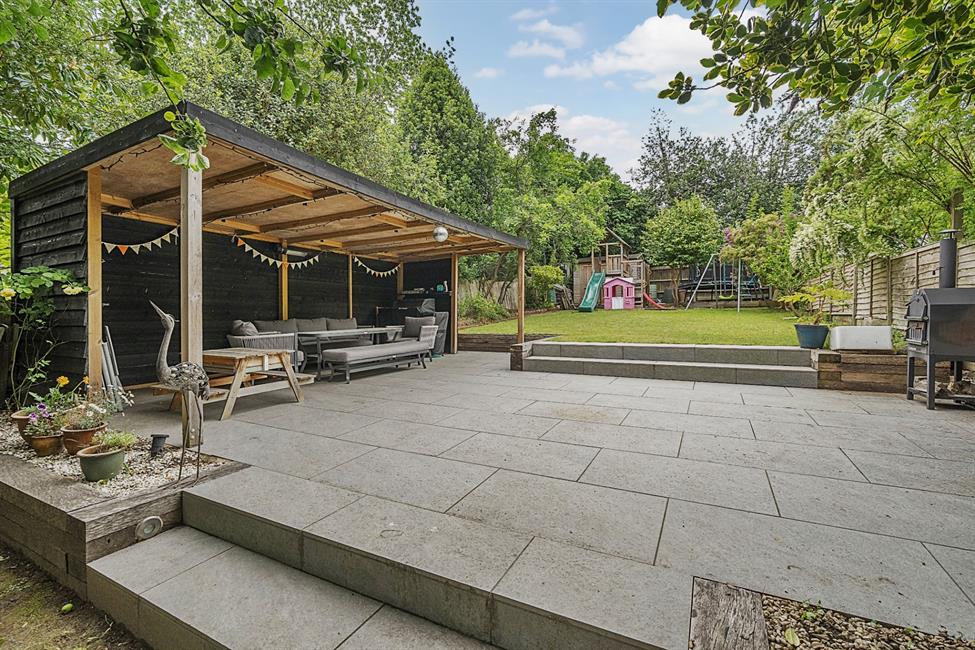 The exterior of the property is equally impressive. To the rear lies a magnificent garden extending over 100 feet, predominantly laid to lawn and framed by mature shrubs, providing a private and tranquil setting. A paved terrace and covered seating area create the perfect space for outdoor entertaining. At the front, a block-paved driveway offers convenient off-street parking, further enhancing the appeal of this exceptional family home.