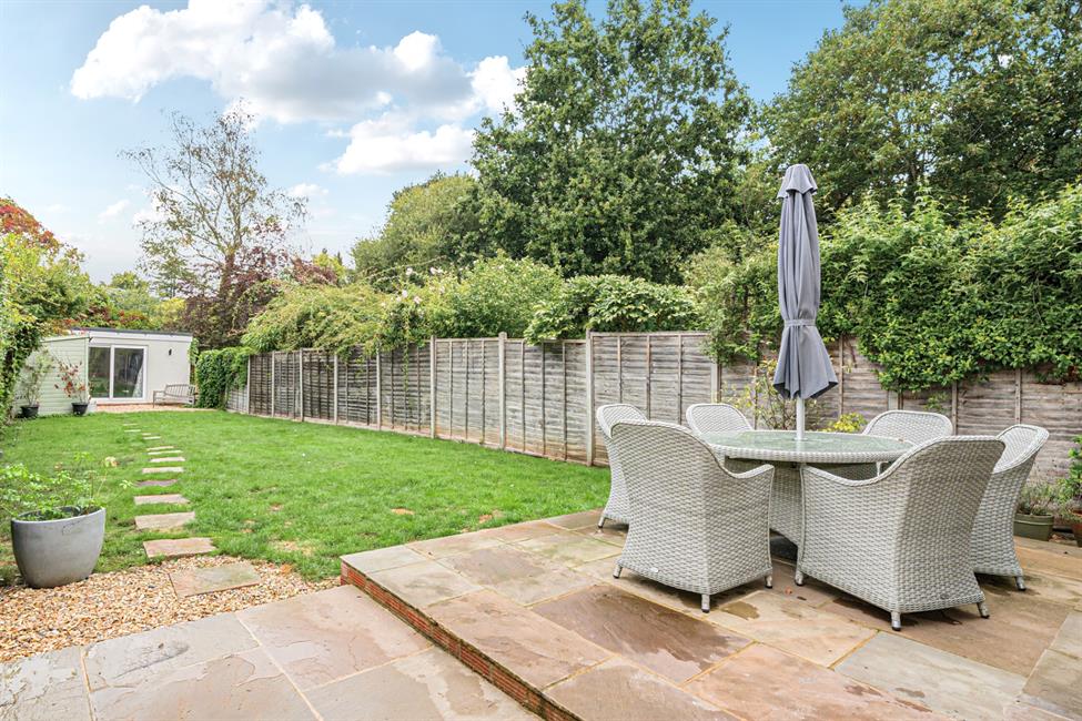 Externally, the rear garden extends to approximately 100ft and has been landscaped for both style and ease of maintenance. A paved terrace offers the perfect setting for al fresco dining and summer gatherings, while a fully powered outbuilding provides outstanding flexibility as a home office, gym, or studio. To the front, a private driveway provides off-street parking for two vehicles.