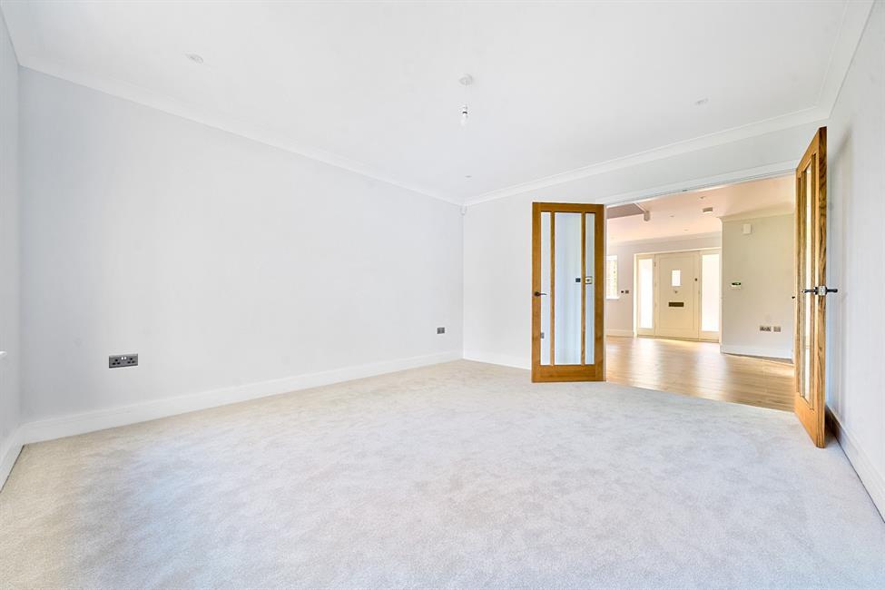 The heart of the property is the stunning open-plan kitchen/dining/family room, featuring a beautifully designed luxury kitchen equipped with premium integrated Siemens appliances, a Quooker tap, and complementary utility room. Triple-glazed bi-fold doors flood the space with natural light and open onto the large enclosed rear garden, perfectly blending indoor and outdoor living.