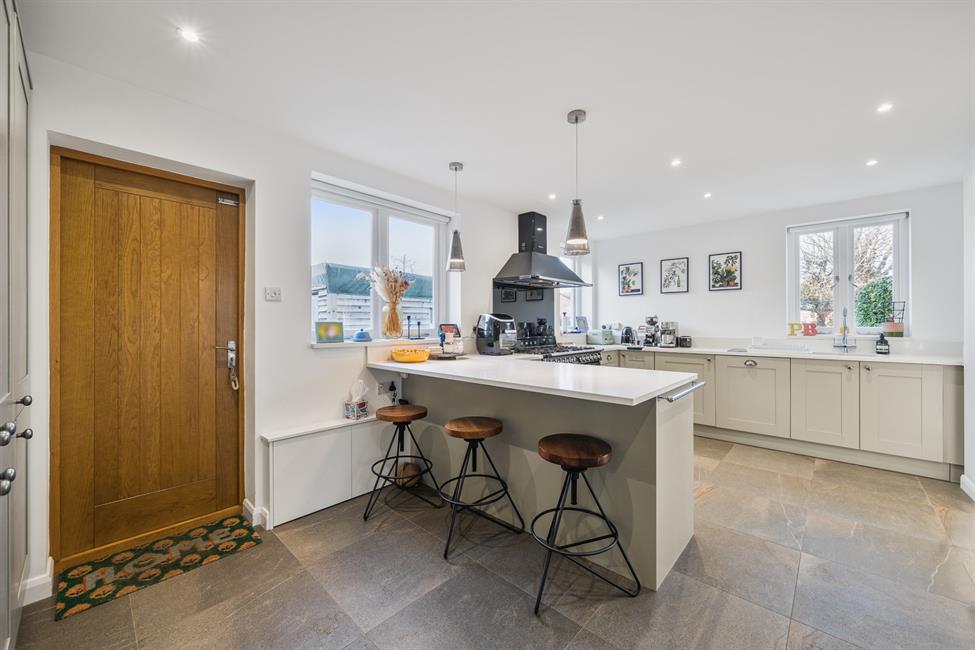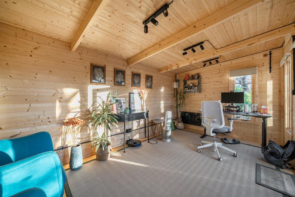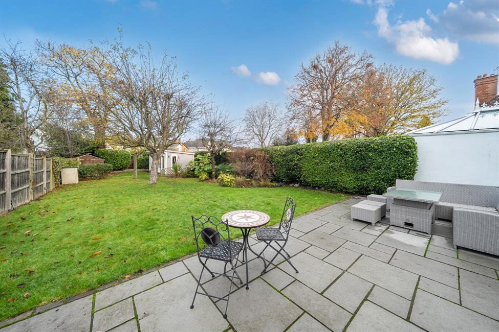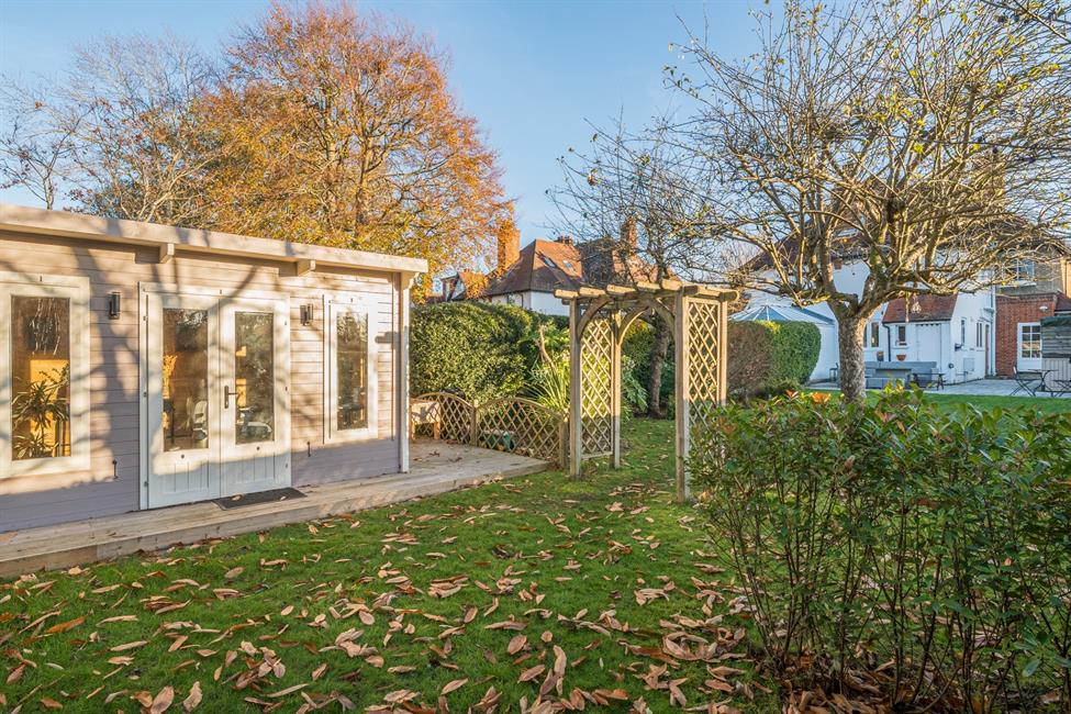 Externally, the property features a generous Indian sandstone terrace, perfect for outdoor entertaining and overlooking a beautifully tended lawned garden extending to approximately 130ft. A versatile garden room/home office provides additional space for work or leisure. To the front, a large shingle driveway offers ample parking for multiple vehicles.