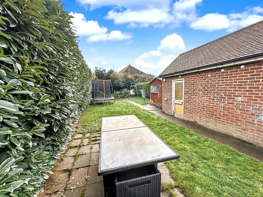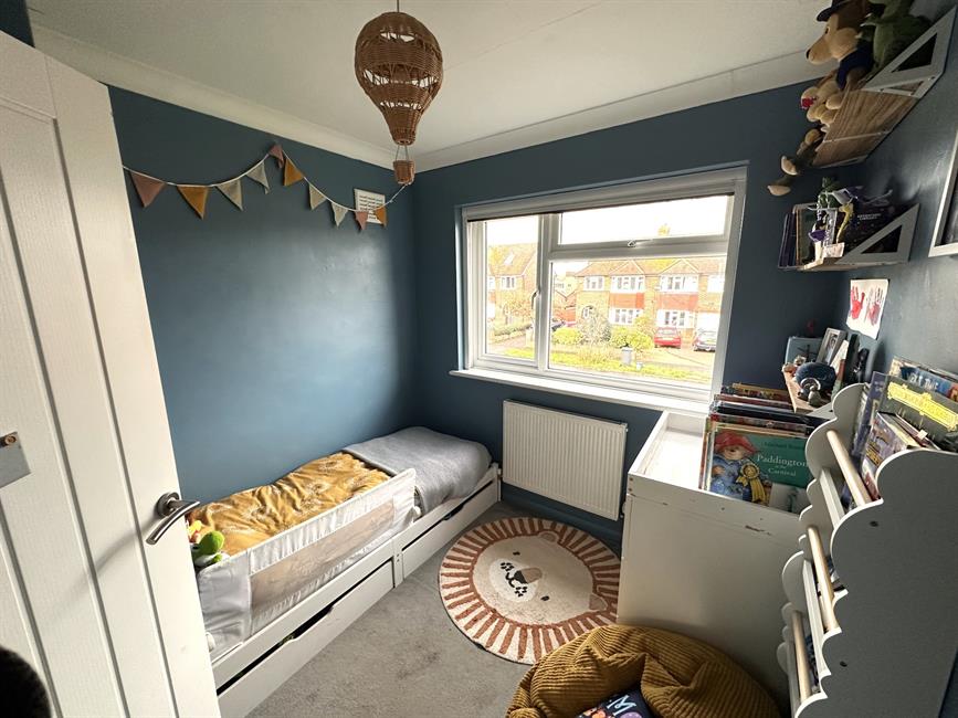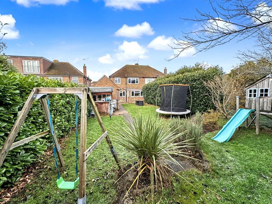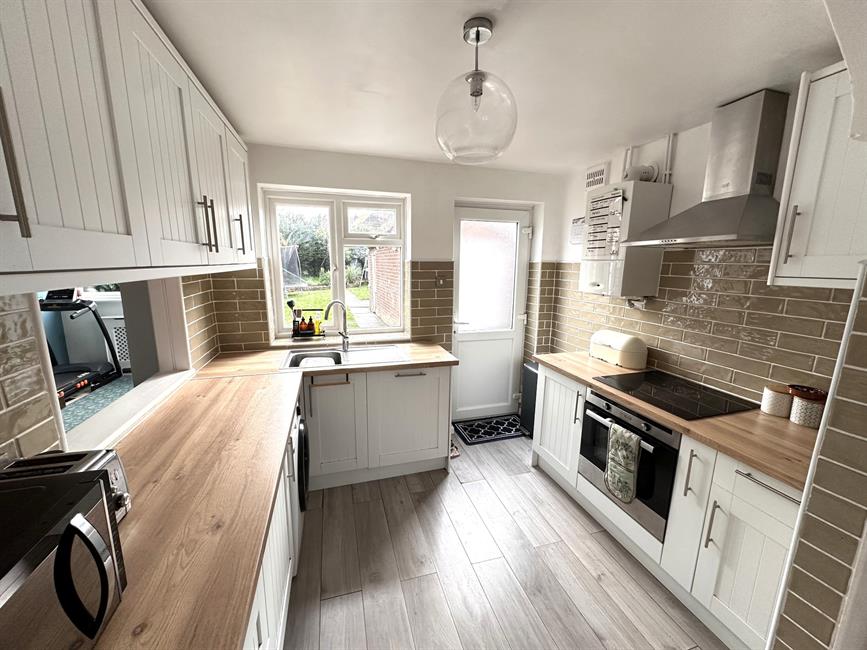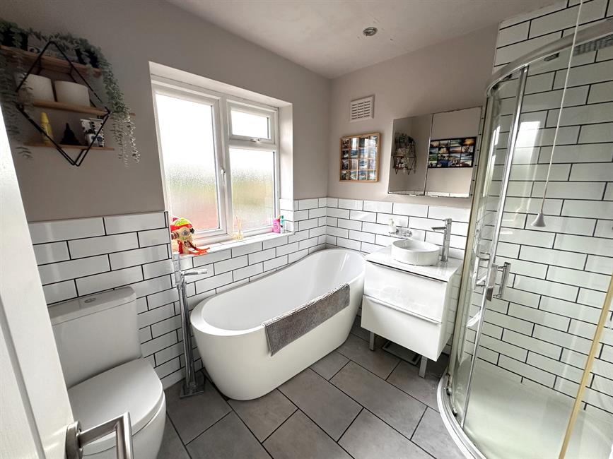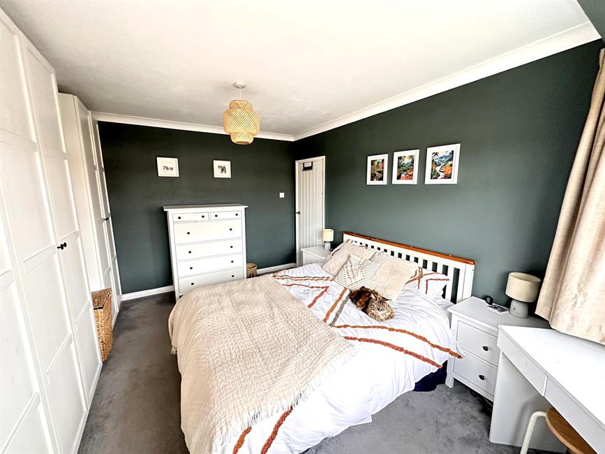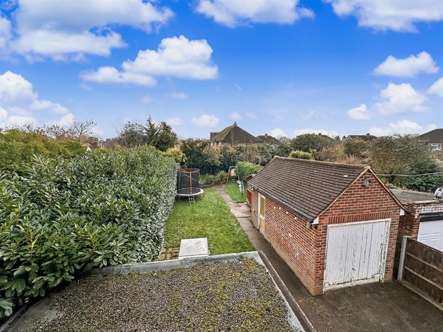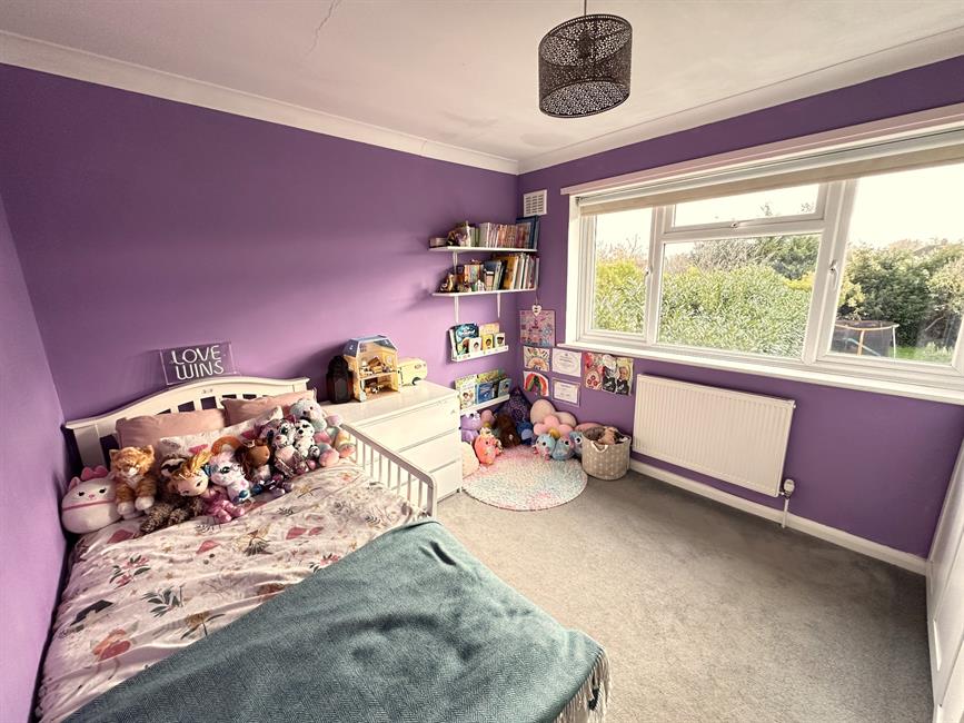 Upstairs, the property offers two generous double bedrooms and one comfortable single bedroom, all served by a contemporary three-piece family bathroom. Externally, the home features a small front garden, a driveway providing off-road parking for several cars, and a garage. The rear garden, mainly laid to lawn with a patio area, enjoys a sunny southerly aspect and offers a wonderful space for outdoor entertaining and family enjoyment.