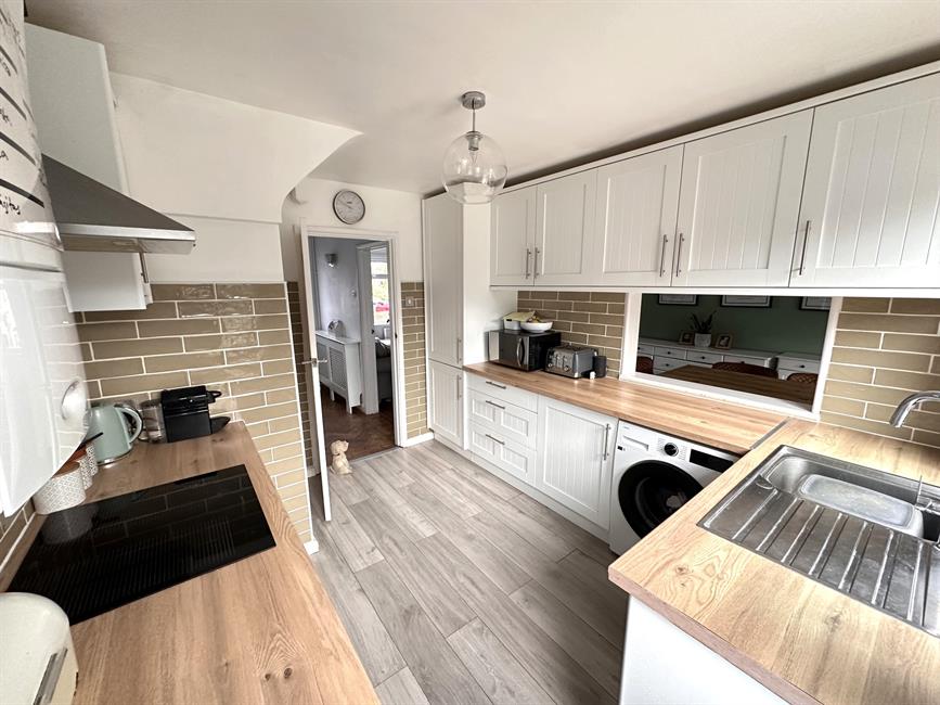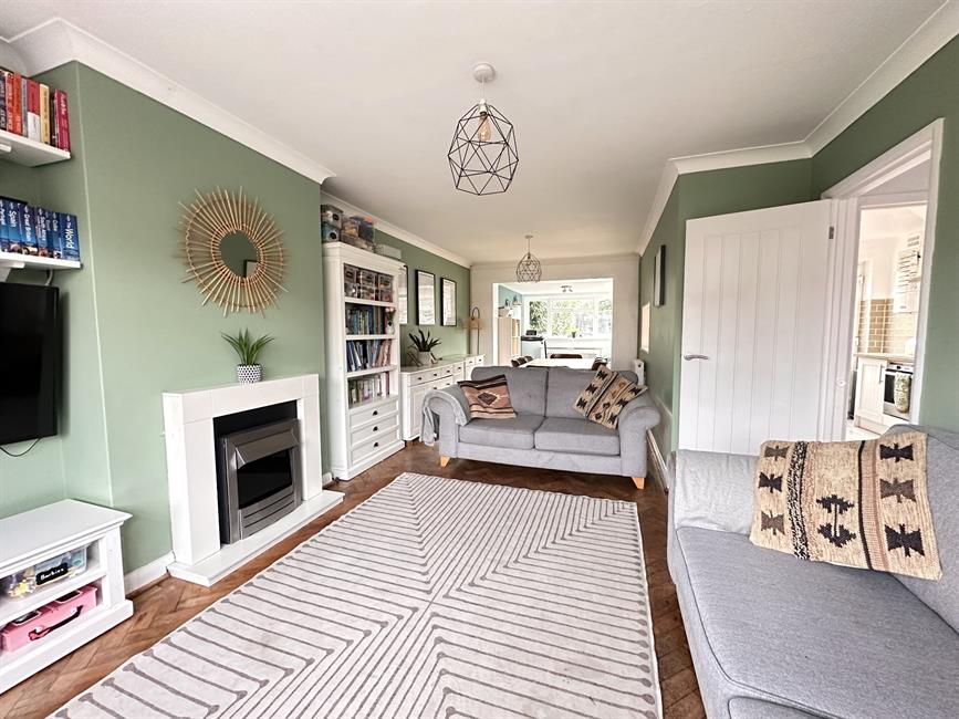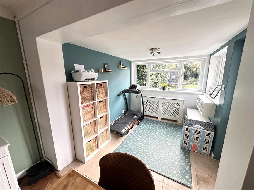 The welcoming entrance hall leads to the modern kitchen and an extended front-to-back living/dining/play room, which creates a bright and versatile living space. The rear extension provides an ideal area for a children’s playroom or additional seating, with direct access to the southerly aspect rear garden. The kitchen offers ample storage and work surfaces, presenting a functional layout with further scope to personalise if desired.