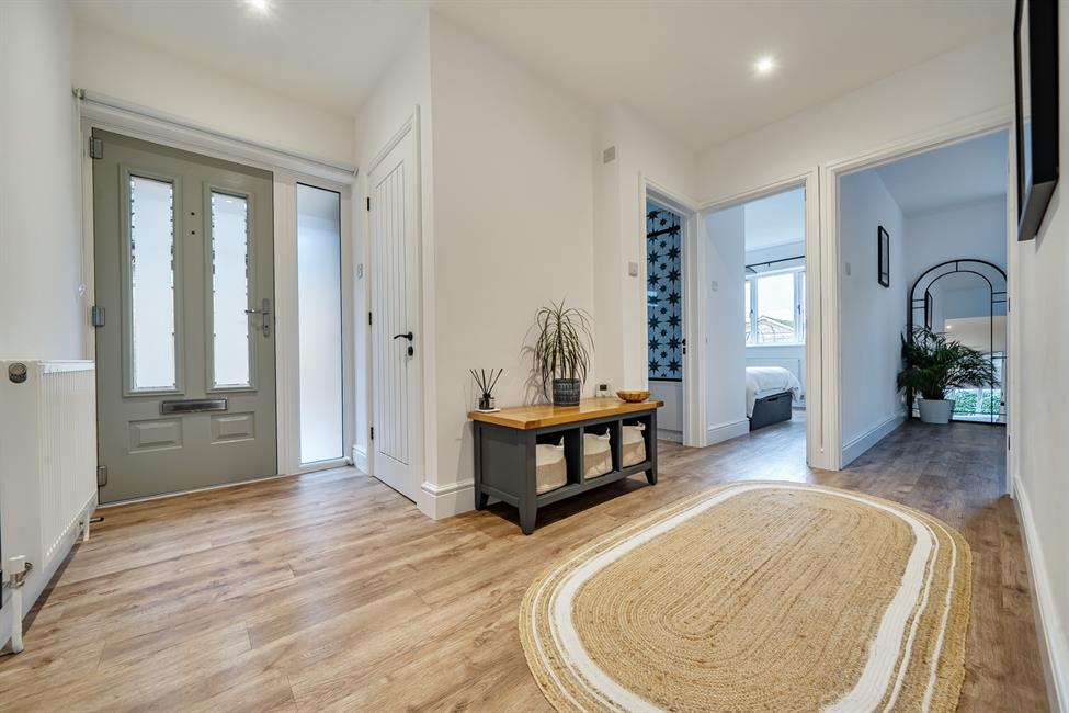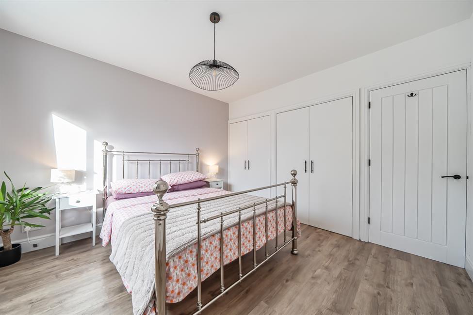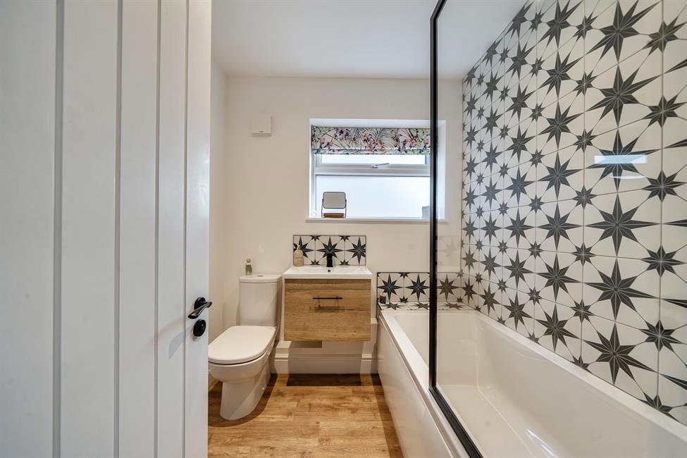 The accommodation comprises three generous double bedrooms, two of which feature built-in wardrobes, and a modern family bathroom finished with sleek white sanitary ware, a bespoke vanity unit, and a bath with a wall-mounted shower. A separate cloakroom has also been refitted to complement the home’s contemporary style. Every room has been freshly plastered and updated with new skirting boards, internal doors, and flooring, providing a cohesive and high-quality finish throughout.