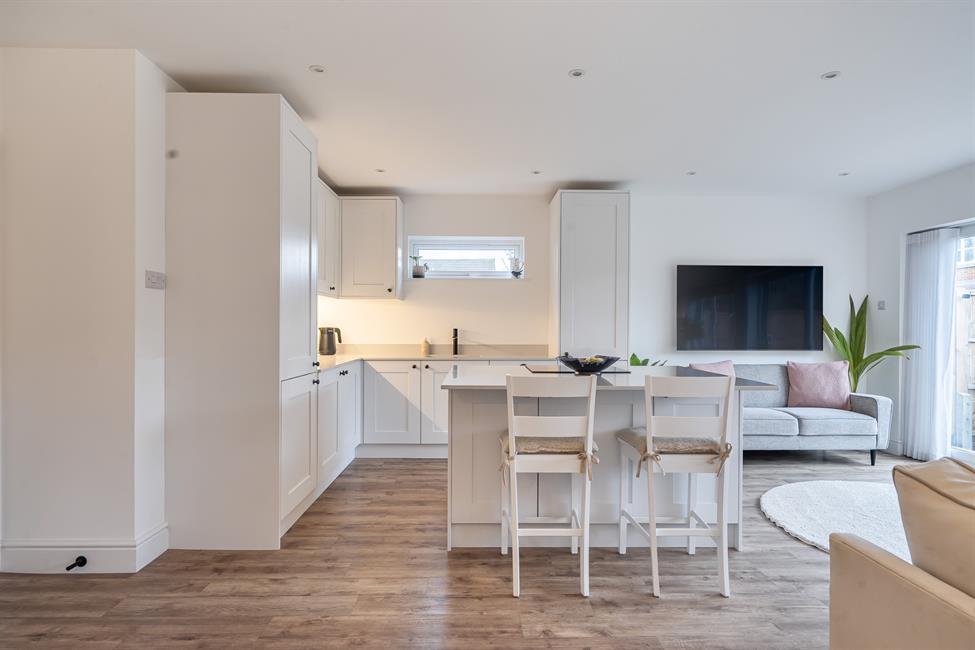 At the heart of the home is a stunning open-plan kitchen/dining/living area. The kitchen is fitted with shaker-style units, quartz work surfaces, and a central island, complete with integrated appliances including a fridge freezer, dishwasher, and washing machine. The living and dining spaces flow seamlessly, offering an ideal layout for both family life and entertaining.