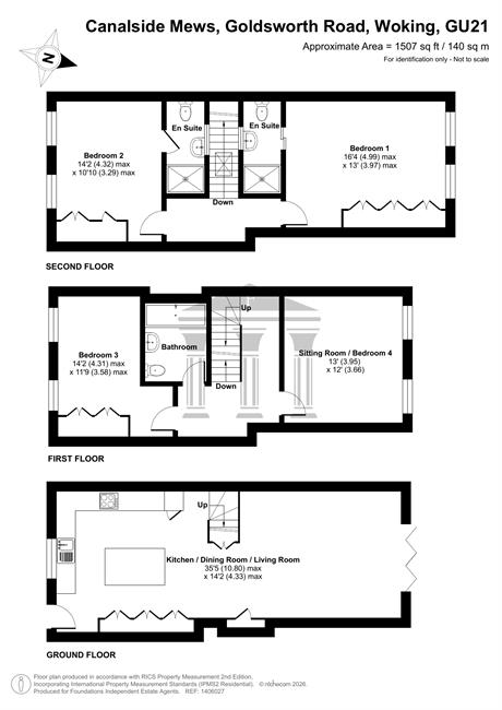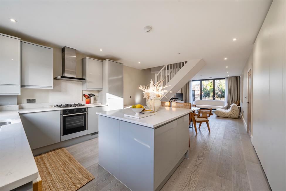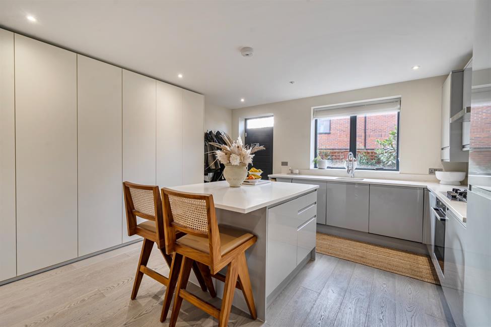 The open-plan ground floor forms the heart of the home, featuring a beautifully crafted kitchen with a central island, a dining area, and a stylish living space, all framed by uninterrupted views over the Basingstoke Canal. The flowing layout and high-quality finishes make this an ideal space for entertaining friends or enjoying relaxed family life. Upstairs, the second and third floor comprise four well-proportioned rooms offering excellent flexibility, allowing the accommodation to be arranged as either four bedrooms or two further reception rooms and two bedrooms, making this property perfectly suited to a range of lifestyle needs including home working or private retreats. The property has been finished to an exacting standard throughout, with underfloor heating at every level ensuring comfort, luxury, and a refined living experience.