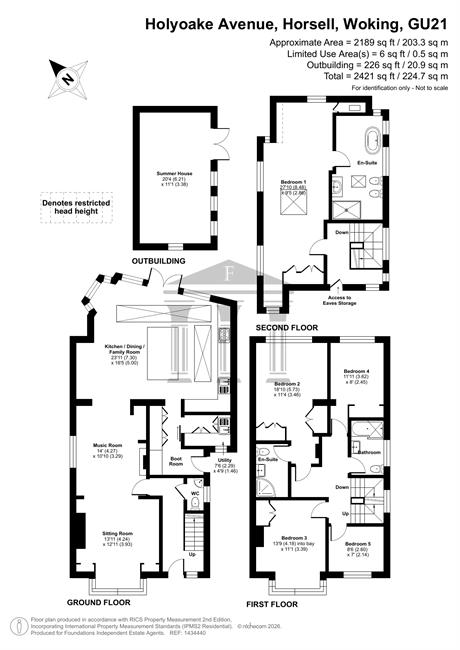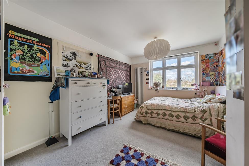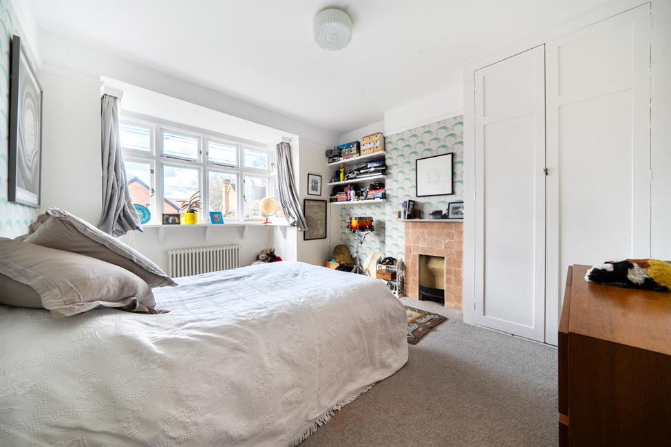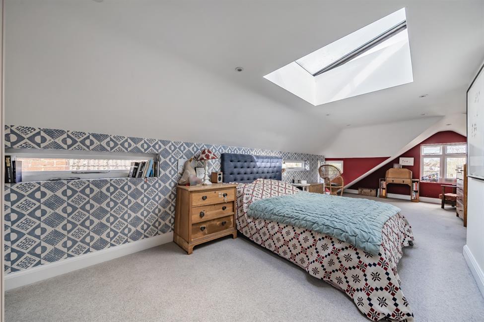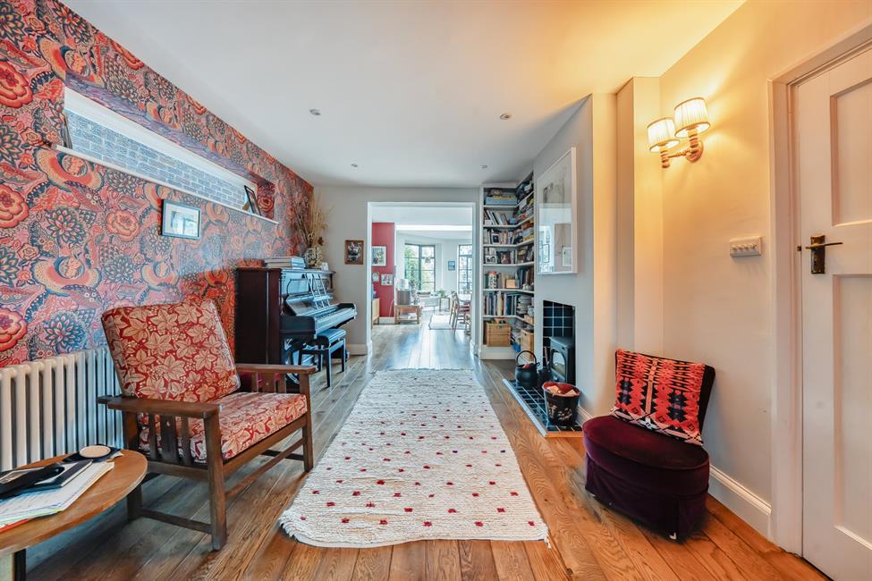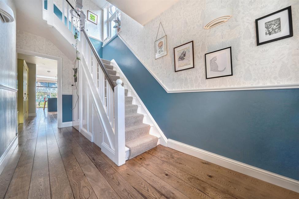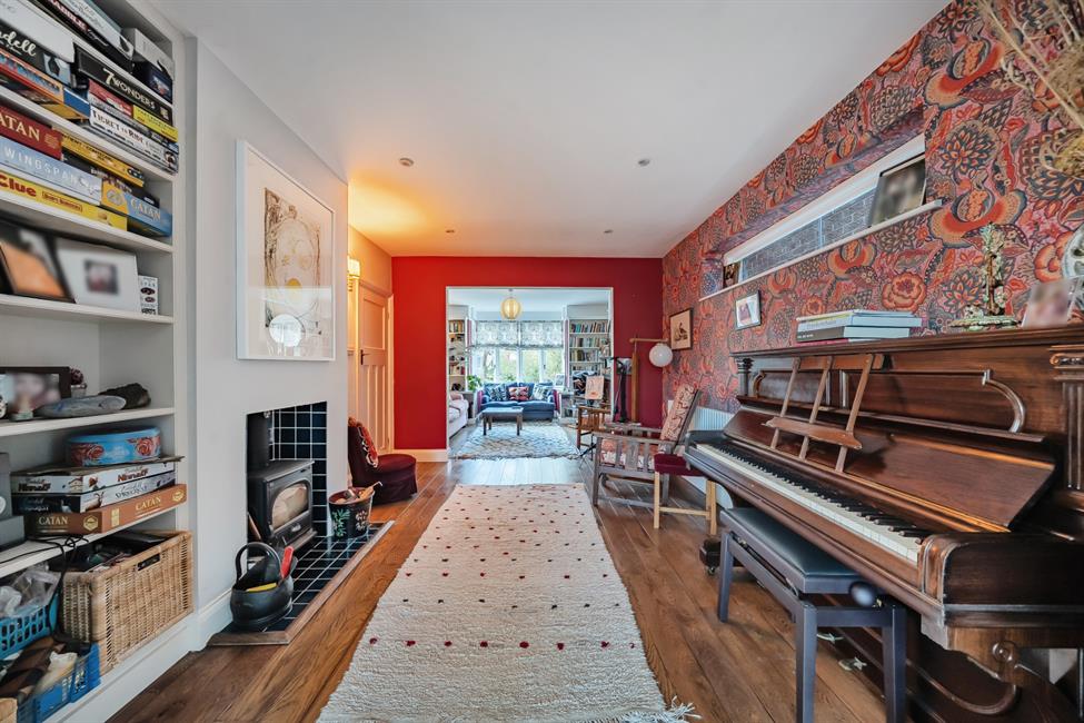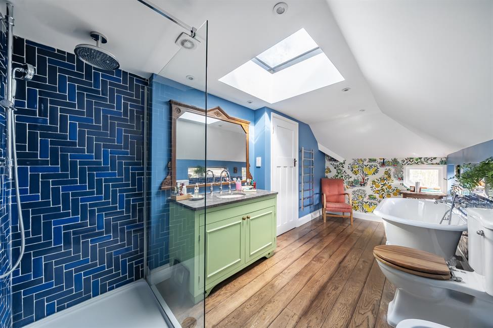 The ground floor further benefits from a charming sitting room with a bay window and one of three original 1930s tiled fireplaces, all of which add warmth and authenticity to the home’s heritage. A versatile second reception room/playroom showcases vintage Liberty wallpaper, while a further reception space—ideal as a music room or study—enhances the flexibility of the layout. A practical utility/boot room includes a conveniently stacked washing machine and tumble dryer, while the hallway offers cleverly designed storage with larder cupboards to one side and a coat cupboard with integrated boot bench to the other. A stylish cloakroom with vintage brass fittings completes the ground floor. Upstairs, the first floor offers four generously proportioned bedrooms, including a beautifully appointed guest suite with its own en-suite shower room, alongside a well-presented family bathroom. The entire top floor is dedicated to a stunning principal suite, creating a private sanctuary with a luxurious en-suite bathroom featuring underfloor heating and elegant finishes, including classic designer wallpaper. In total, the home offers two impressive principal-style suites, ideal for modern family living or guest accommodation. Throughout the property, engineered stained wooden flooring runs seamlessly, enhancing both the aesthetic and durability of the home, while additional character features, including a working wood burner add to the inviting atmosphere.