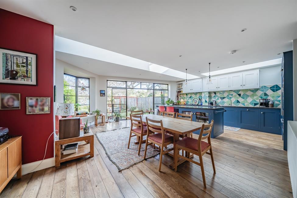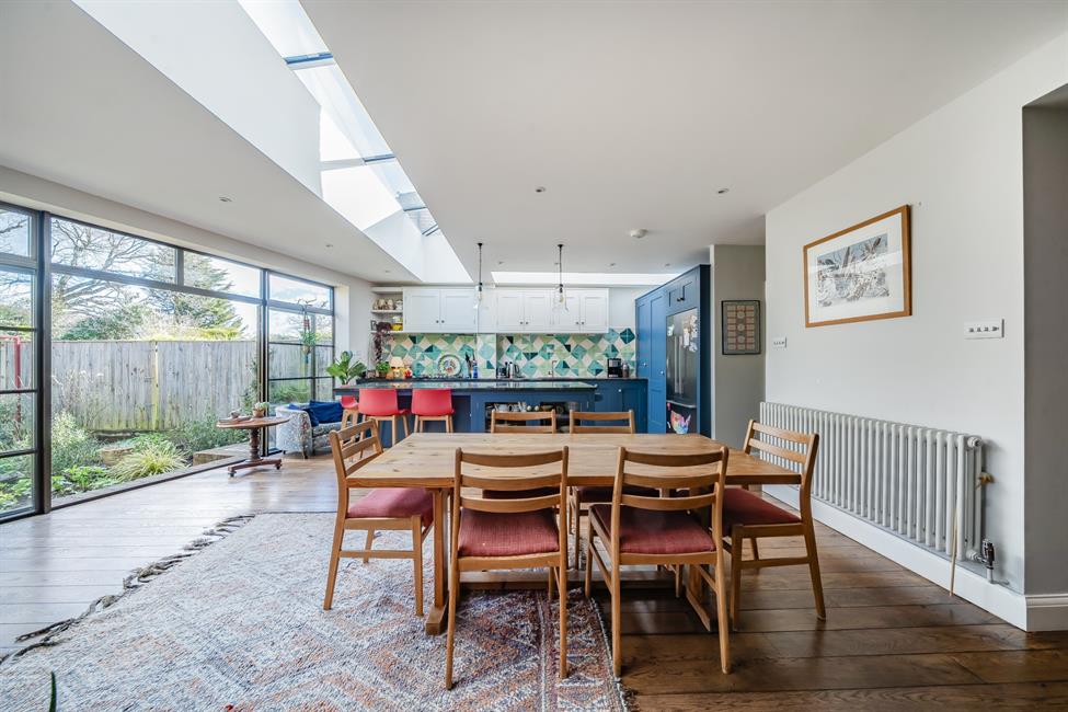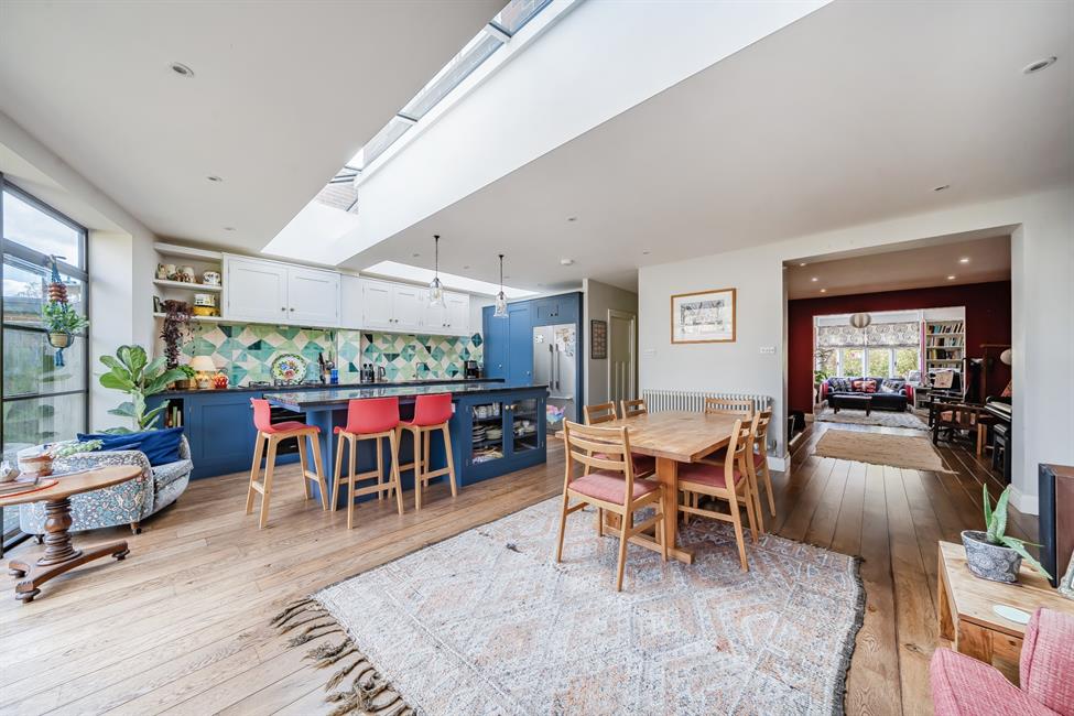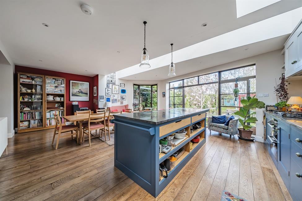 At the heart of the property lies a breathtaking open plan kitchen, dining and family space, designed for both everyday living and entertaining. The bespoke kitchen, expertly designed and built by Sustainable Kitchens, features a central island, an American double-width refrigerator and high-quality finishes throughout. Expansive glazing, including distinctive Crittall-style metal windows, two sets of rear doors and a dramatic sky lantern above, floods the space with natural light, while a contemporary off-centre design introduces a striking modern bay window seat overlooking the garden. This remarkable space enjoys uninterrupted views across the beautifully landscaped south-facing garden, creating a seamless connection between indoors and out.